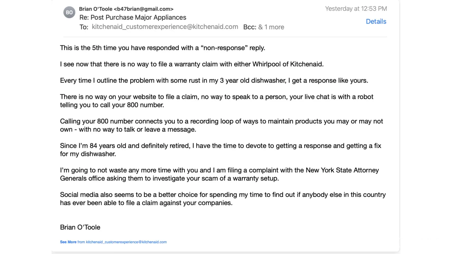 It's impossible to file a warranty claim with either Whirlpool ( the parent company) or Kitchenaid as there is no way to file a claim.