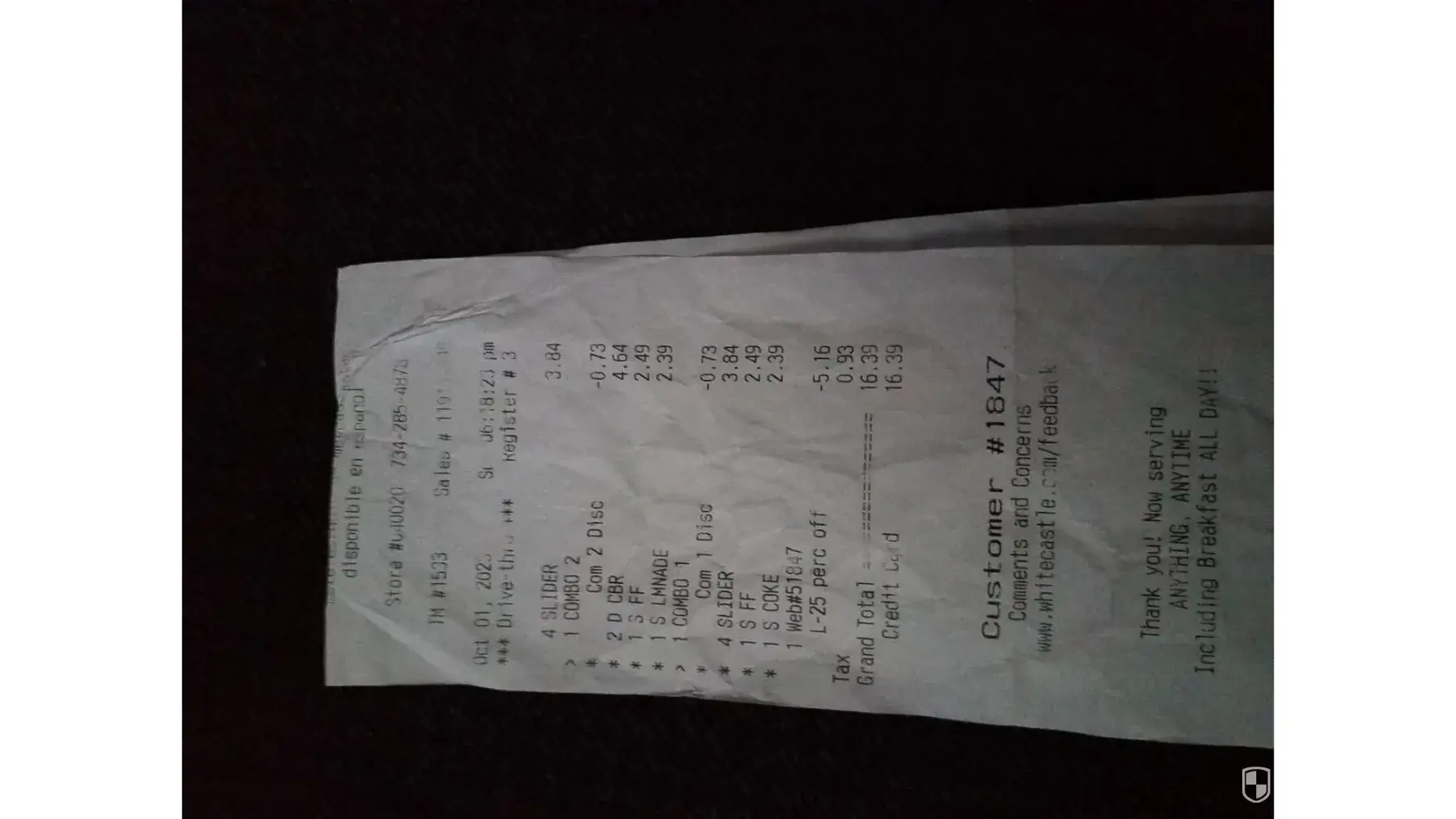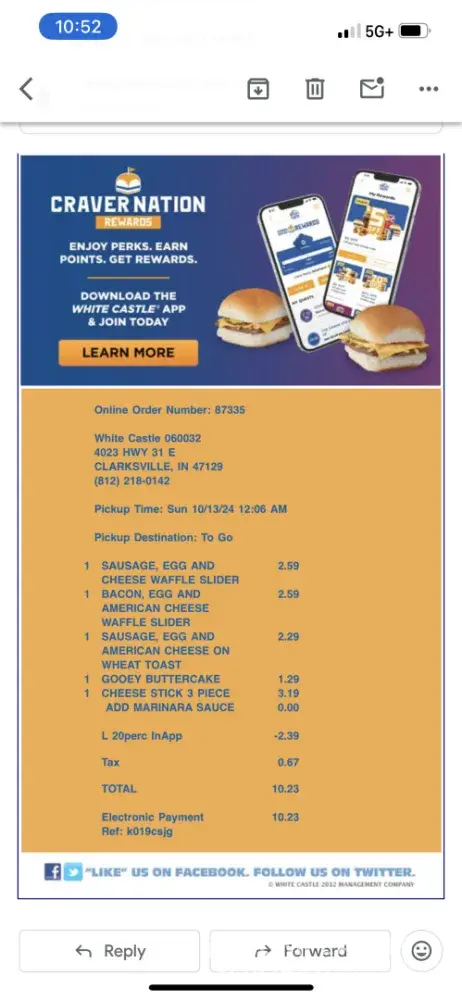 White Castle 110062 sale#[protected] employee #1515. 5/19/2024 14:54:34. Ordered 12 cheeseburgers 1 med fries 1 cheese cup for $.99. One dollar ! Cheese cup not even half full. Have screenshot Ridiculous wasn't enough for half the fries with only tiny amount of cheese on at $15/hr surely employees know difference in full and half full when adding screenshot...