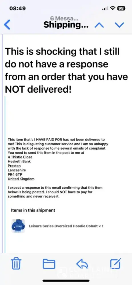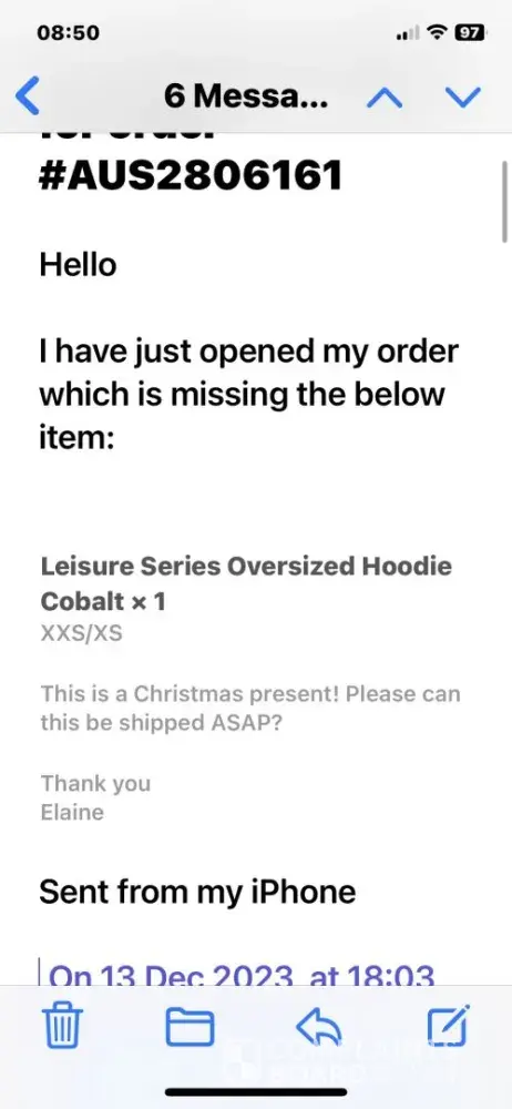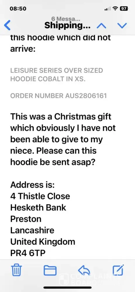 On the 24th of November 2023, I placed an order with White Fox. I ordered three hoodies and three tracksuit bottoms as part of sets. I also ordered an extra Hoodie. This extra Hoodie, which was a present for my niece at Christmas, never arrived in the package. I instantly emailed white fox to explain this and initially got an email back saying my email was in a queue and to give more information, which I did. After this I never received another email. I have emailed countless times chasing this up and even emailed from my work email address to try and get a response. I’ve never ever had a response, and now my niece is let down without her Christmas present and we have paid for a Hoodie that has never arrived. I’m disgusted in the fact that they seem to just be ignoring every email I send complaining about this.