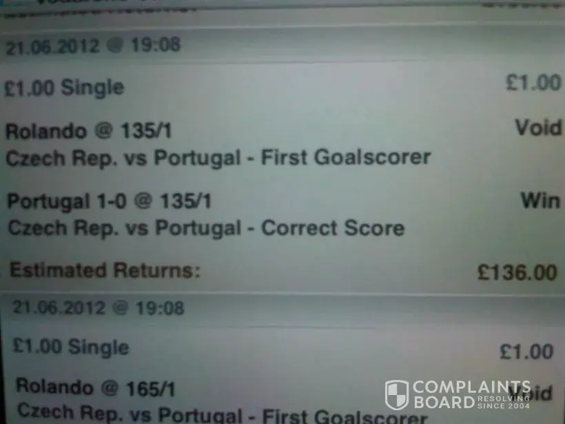 you bet on rolando and not RONALDO. Rolando is a centre back who plays for Porto. Looking at the screen, it seems as though you placed the bet online, hence, it is your own responsibility to check you have the correct selection. Also, common sense would state that 1-0 portugal ronaldo first GS would never have odds at 135/1, it would be more closer to 6s or 7s. Bet was voided as rolando did not take part in the match, therefore, bet was voided and hence settled correctly.