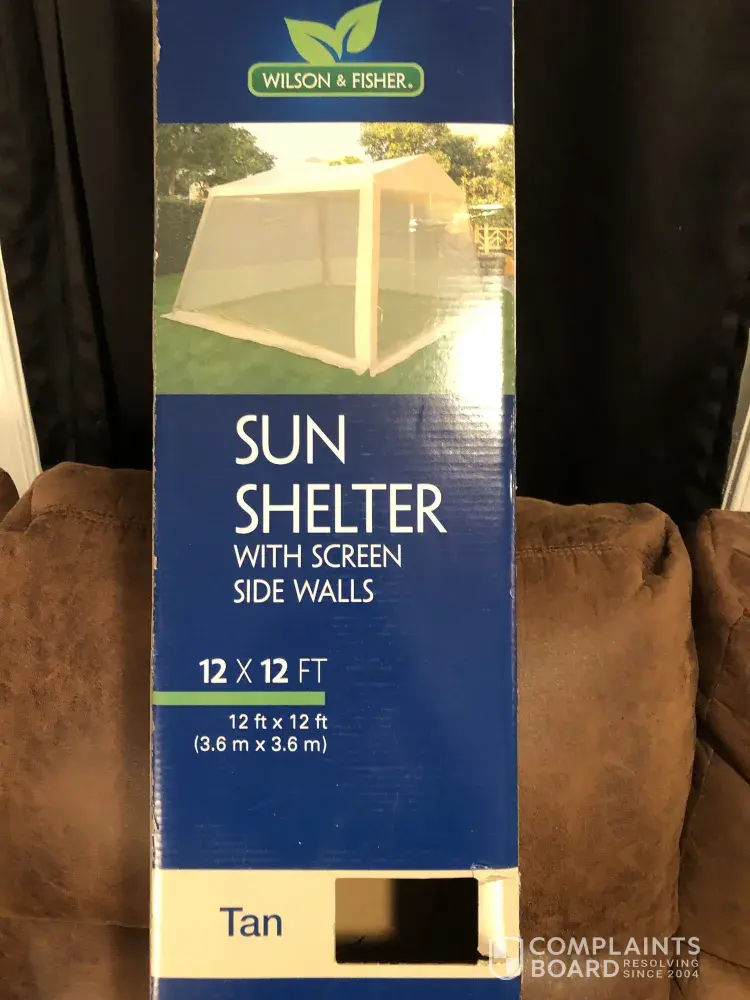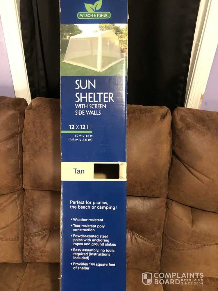 Brand New out of box Sun Shelter with Screen walls. Tent purchased from Big lots for a July 4 party. Put up and a light gust of wind broke plastic corner holders. Screen ripped. Parts were not fitting together properly and were so loose. It immediately fell to ground knocking all pieces apart. Cracked all plastic pieces and bent metal. Ruined all parts. No replacements in box. Very upset it didn't last 5 minutes.