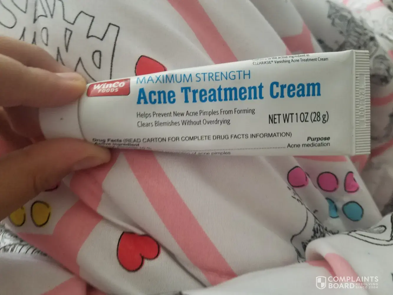 I bought a cream from winco food maximum strength acne treatment cream as I had pimples on my face and it burnt me. Never have my skin look like that. This is not right. it burned my skin. I recommend not using this particular cream ever again. I wish to get a full refund for this product. I have never had to experience such a bad reaction. You should be sued for even keeping a product like this in your store. These are burn scars.. every time I touch my skin peels off. The first day I put I got up to extreme dryness this is second day and my skin looks awfully scary