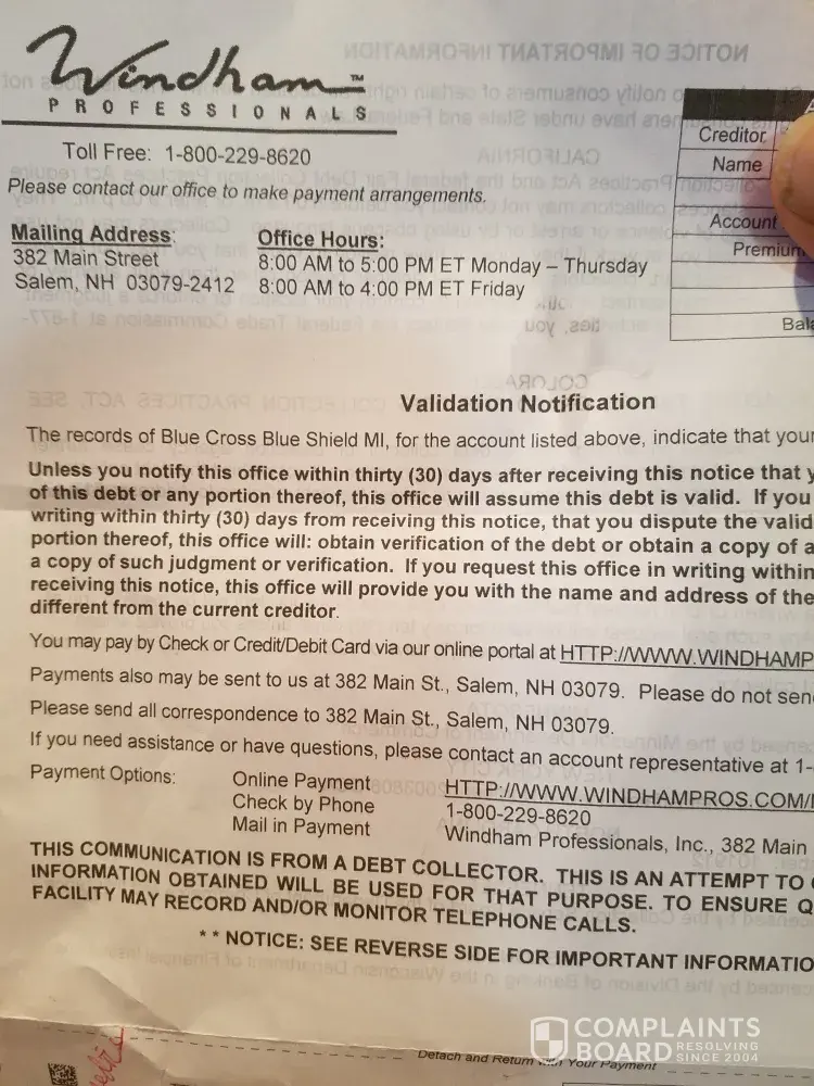 I received a notice today from windham professionals claiming that I owe them over $160 from over a year-and-a-half ago. Let me start by stating that I never pay bills late, have pristine credit, and i'm in my mid-forties. After looking into the matter I found that the bill was paid in full from blue cross blue shield to my medical provider. I also talked to the medical provider and they said that they receive the funds long ago and not to worry. Both blue cross and blue shield and my medical provider also said that they do not use this collection agency and that it was bogus. Be aware if you receive anything from this company. It is a scam!