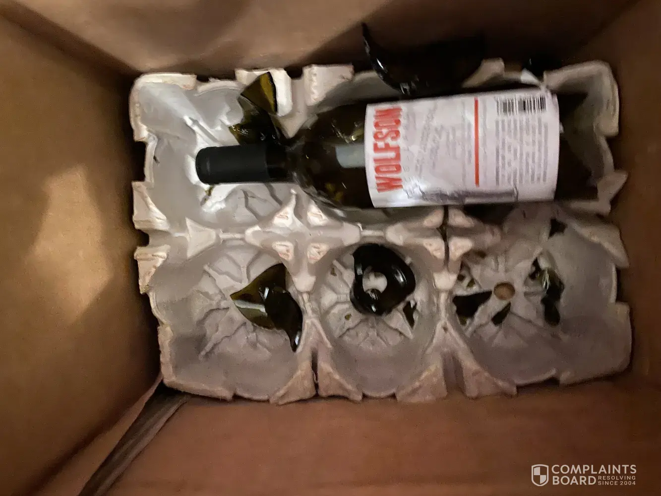 Delivery of 6 bottles of wine on Saturday, June 26. One bottle was broken: "Wolfson Cellars Red Blend California 2018" Item # NO1110.