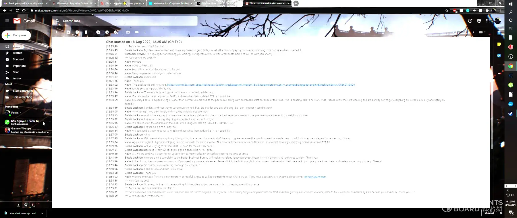 Hi, My name is Betsy. I recently purchased a drink from Wine.com for my husband's birthday. I was very careful when I made the purchase because I wanted it by my husband's birthday (which is today). The item never arrived and customer service was not helpful at all. She ended the conversation with me and refused my refund request. My order number i...