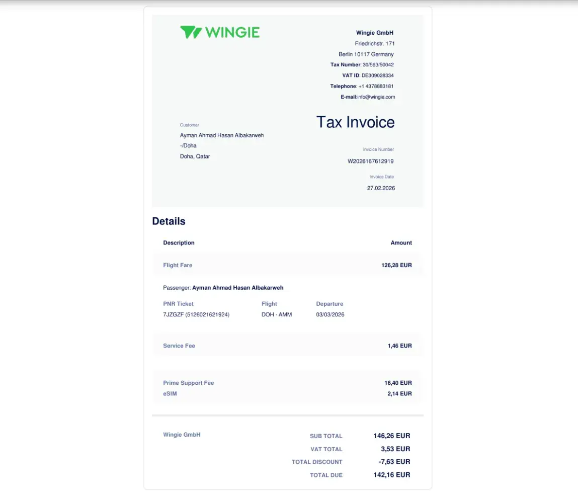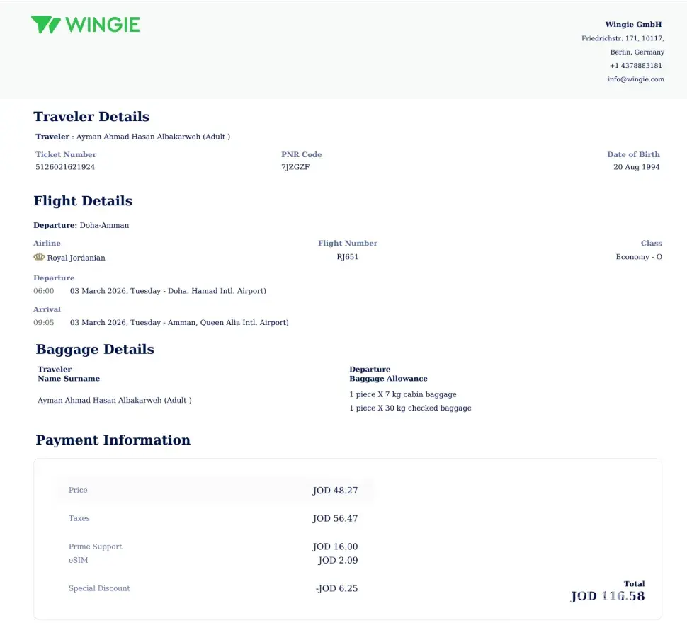 Greetings, I booked a one-way ticket from Doha to Jordan through the Wingee flight app and confirmed the booking on February 27th, with departure scheduled for(3/3/2026) 6:00 AM. The booking was confirmed by the company, and I received the ticket via email. However, following recent events in the Middle East, my ticket was canceled on March 2nd. I have...