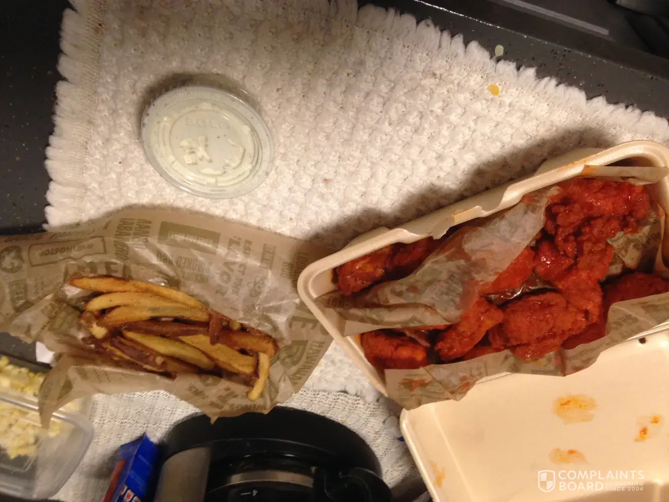 Cajun fries not the sweet fried 2 honey dipping sauce 2 ranch sauce and order 3 extra ranch sauce order was 62.32. When I got home I had 50 wings just fried plain not fresh, left over hard cold sweet fries not the Cajun seasoning fries NO dipping sauce, No veggie sticks, I call for a manager the employee told me he couldn't talk he was outside I told the employee what happen he told me he couldn't replace my wings only fries and sauce and veggie sticks. This isn't the first time this happen on the evening shift no problem on the day shift. Please correct this problem with your employees this is not professional. This is too much money to be spending for cold nasty food if you need to contact me