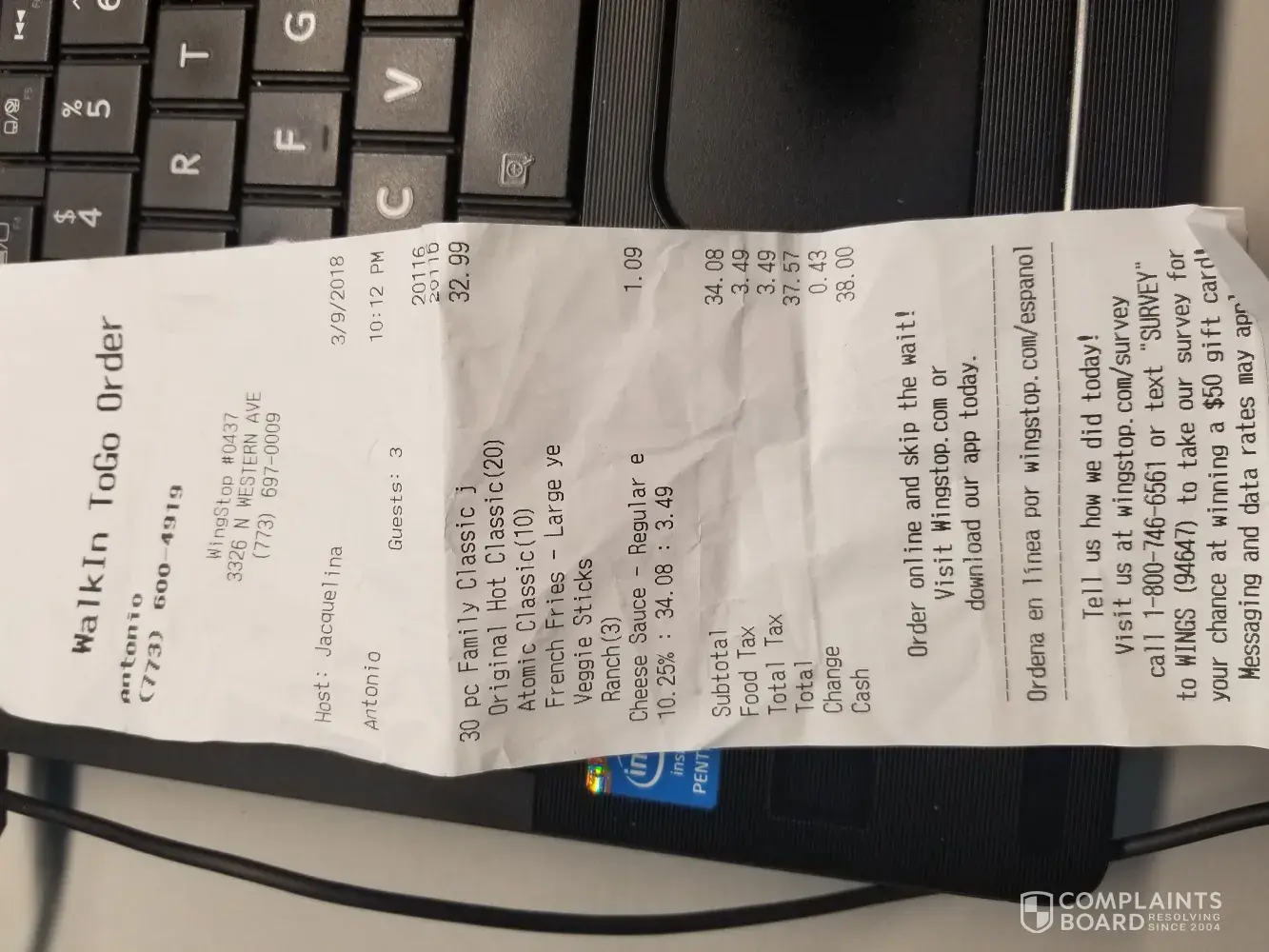 This incident, happened on 03/29/18, i, antonio crisantos, placed an order on phone at 9:56 pm was told 18 min. Arrived to pay at 10:12 pm and the cashier, jacquelina after fighting with me about veggie sticks I asked to substitute she said no, of course I understood, and just asked for the veggies to not be placed in the bag, I payed and sat down more people arrived and left before me that placed an order there, I see a bag they never called out my order was sitting up there and me waiting like 40 min I asked how much longer for my order? She picked up the bag I have been looking at since I arrived and handed it to me, I replied "are you kidding me? That bag has been sitting up there since I got here!" this is after I waited 24 min extra trying to be understanding if they were busy. I don't get an apology, I get a response of the cashier "its not my fault" I grabbed the bag and left, only to find out when I get home there is no fries that I have ordered, returned to the restaurant requested my fries, from the same cashier, jacquelina, and asked if I wanted a refund or my fries, I replied "I just want my order right, I have never had so many mistakes and I order every week" I always order the 30 piece crew pack, she gave me my fries, I left again after her and an attitude, never once did I receive an apology, and recommend highly that action for this intolerable actions is taken against this employee from wingstop #0437 on 3326 n. Western chicago, illinois. This is unacceptable behavior, and wish for you to contact me at [protected]@gmail.com on how this matter was resolved.