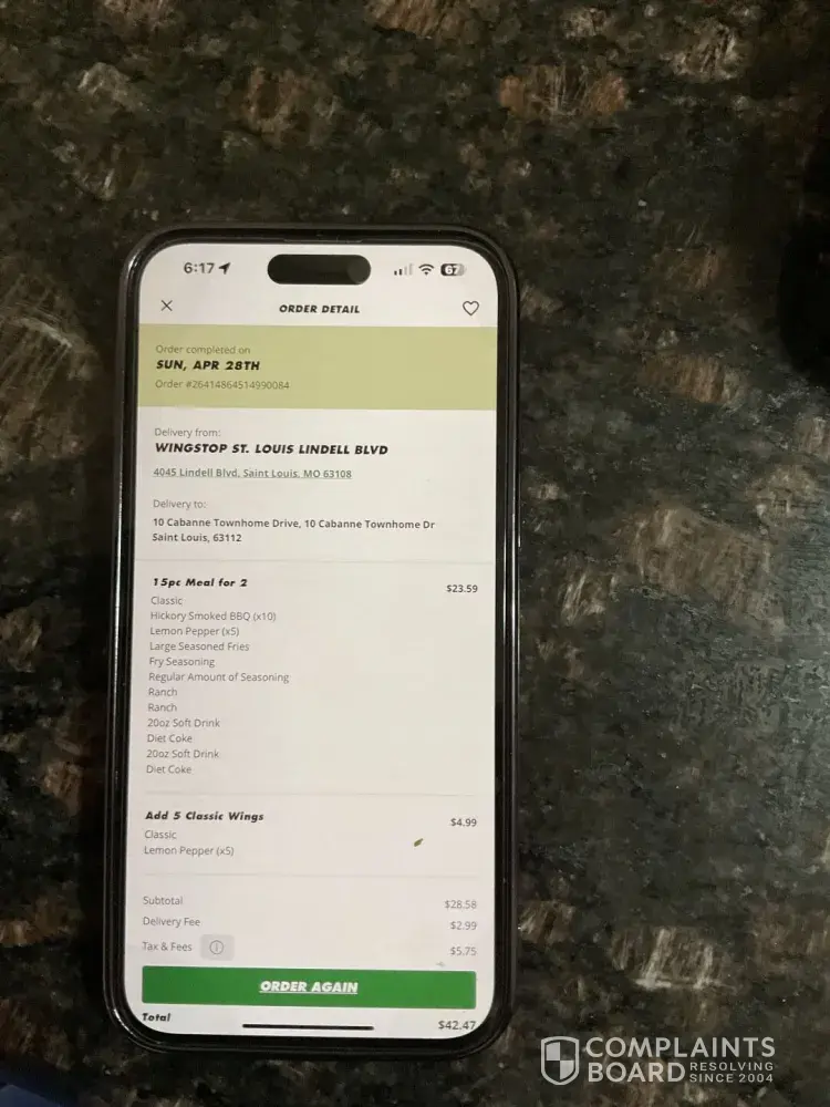 I placed an order online for $25.16. I never received my order by delivery. I ordered from the Wingstop website. Order number#[protected]. My order was never delivered to my home. I have been trying to get this resolved asap.