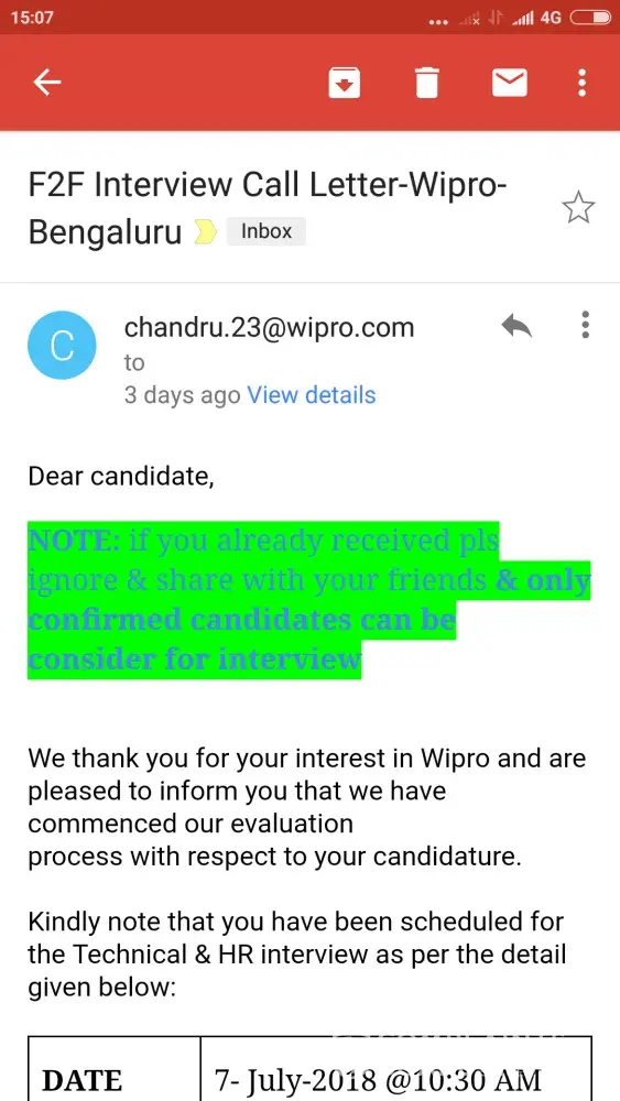 I have received interview call letter from Wipro and went for interview today to Bangalore electronic City office but I got to know after reaching venue that there is no opening for my skill set.