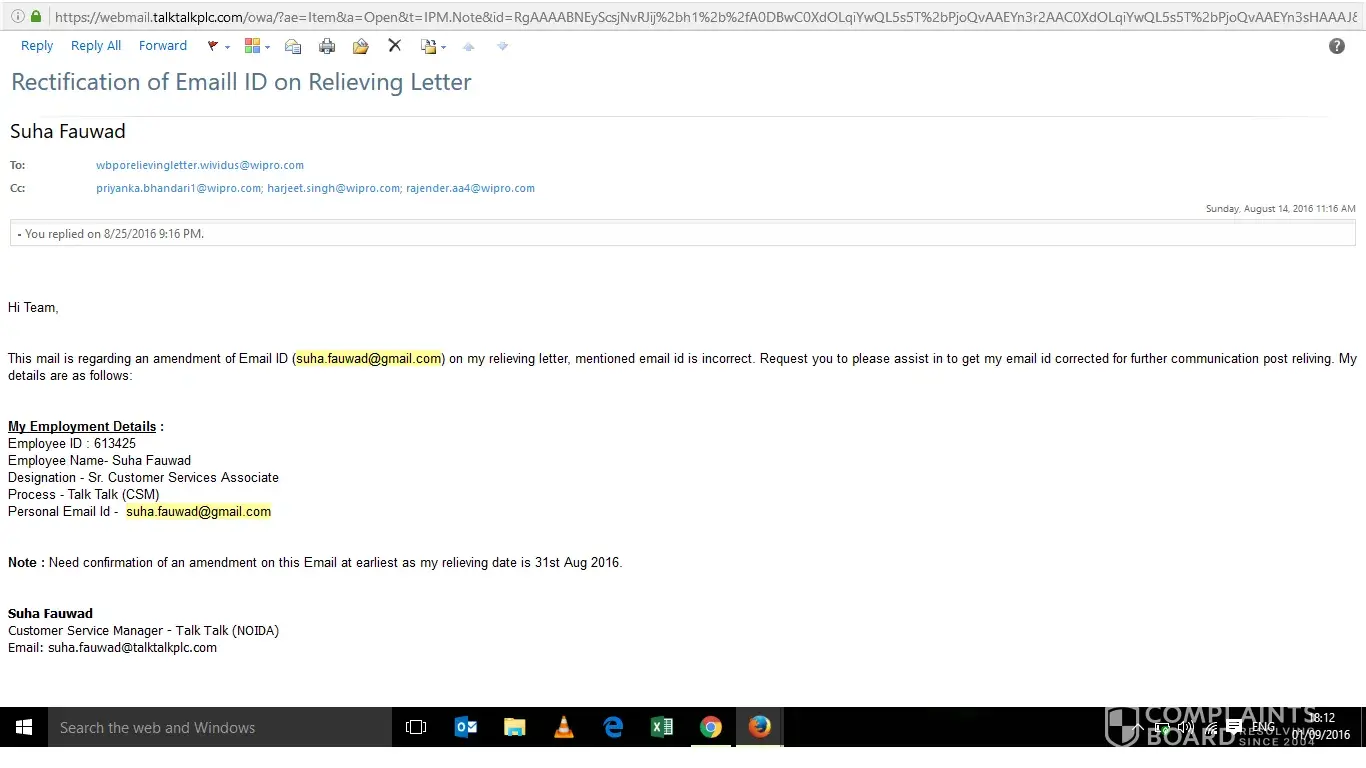 I have left Wipro on 31Aug'16 with 2 months notice period. While submitting notice period wrong email address was updated by mistake on my resignation which was submitted on wipro portal. I requested my manager, CCM and HR to help me with this so can get my reliving details on time after 31st Aug'16.