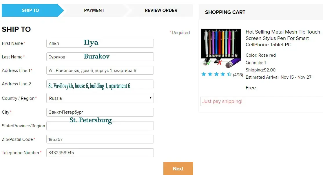 I recently had an issue with a charge o my credit card for a cancelled order. Support was no help, as they kept saying it was never charged to my card. i received item I reordered and it was the wrong thing. Tell me send pictures and more pictures and more pictures. I finally receive a credit, and then get notice that they received my order for stuff i did not order. I go in to cancel it and I find my log in is now in Russian, the pages are in Russian, the order was under my name (which was changed) shipping to a Russian address! I got the stuff straight with bank. Just went in to order stuff to replace wrong order and there is another Russian address as showing as shipping address. I have screenshots of both of these. i removed my credit card from my settings today and will notify my credit card company to not accept any further charges past what i did today. But this is fraud! They replay with some stupid message in Russian, Sad part is they have good prices and unique stuff.