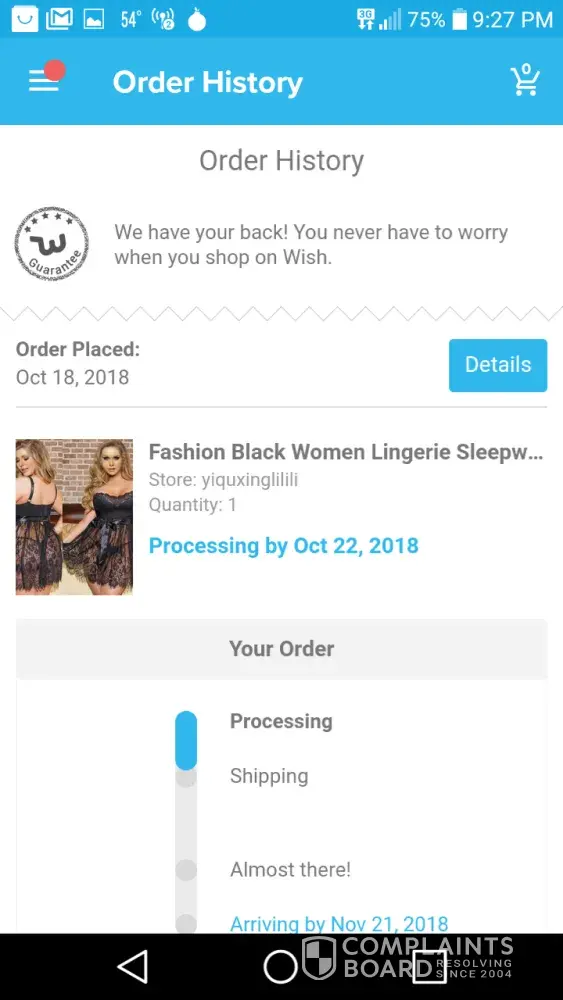 I had ordered 2 separate items from wish that were supposed to arrive mid October. Neither item arrived and I have contacted Wish twice to request a refund. Both answers I received stated I need to wait longer and contact them by a certain date. I have contacted them twice with their requested date and they just keep pushing the date forward. They have taken my money and not delivered the product and are refusing to issue a refund. BUYER BEWARE