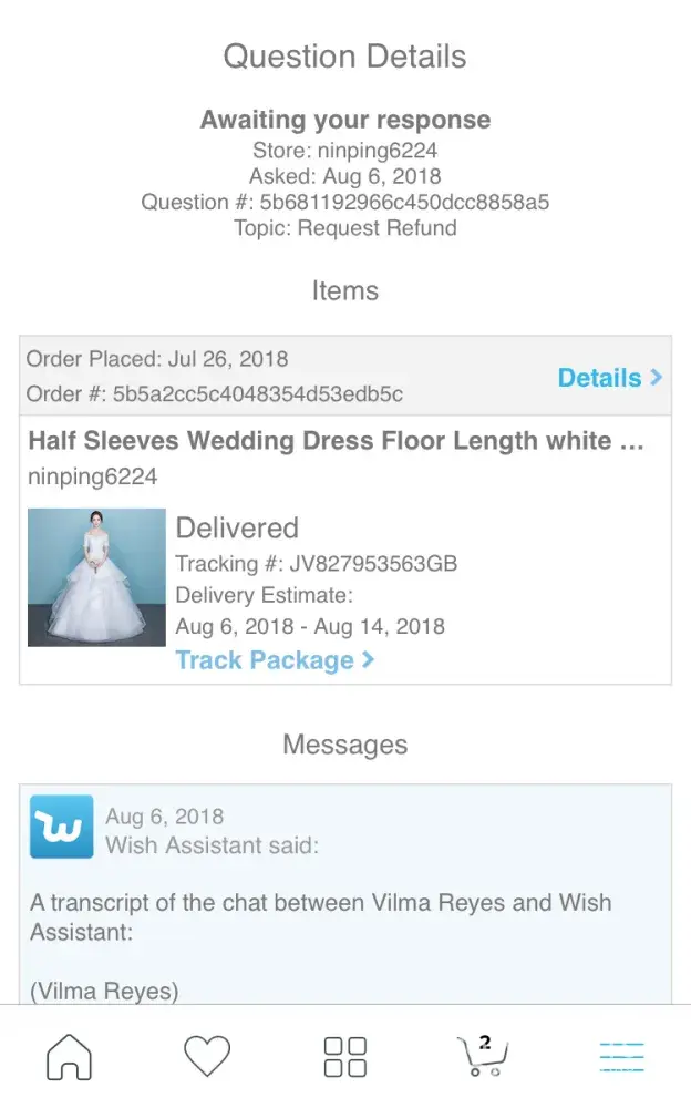 I have returned a wedding gown to the store ningpin6224 before end of return date and asked for REFUND. Parcelforce returned the package and was signed by the company as a proof of receipt. Up to now i havent received any response from them. Custmer service closed the window for Refund and said im no longer eligible for refund despite ive mailed the parcel back before the expiry date. I have sent a copy of receipt as proof of dates. Ive escalated my concerns yet i havent received any reply as of this time.