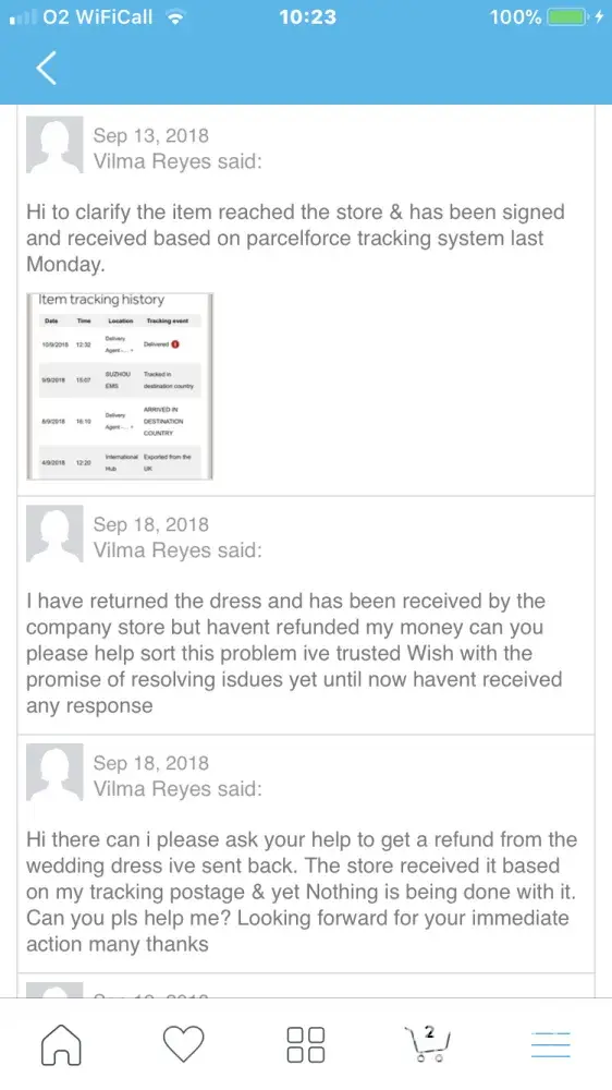 I paid for 3 electric bikes (£ 1300 Sterling) of which I received none ? Wish keep on sending the same request over and over again repeating request a Refund through the App but to no avail ! I went to Royal Mail Uk who informed me that the tracking numbers given to me were against items delivered to a different address in a different country (England ) ? I have sent Proof that Royal Mail did not deliver to me but Wish support must be the most unreachable customer support service I have ever dealt with ! I have sent nearly 100 requests now and require help ?