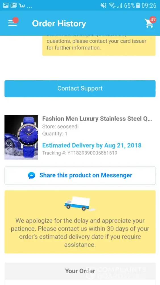 I hav order a clearing mop wit is not deliver to me till now... and aft 3 sept der is no update on the app about my parcel ... der is no C.O.D on app so I paid money online...one more order has place on my behalf... and decuted from my card by there own... wit out my permission... so I cancel ...still der is no refund of my money... from der wish app.
