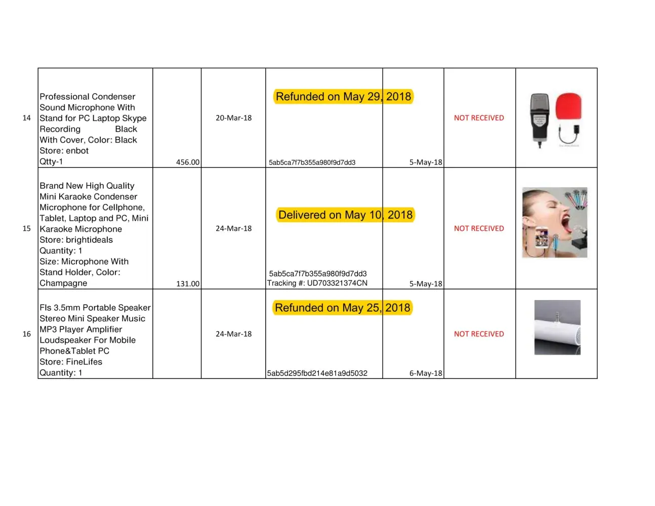 4. the attached list have updated information in highlighted text and Item endorsed at # 1, 2, 3, 10, 12 &13 are not received and even wish.com not refunding my amount too. The whole amount is figuring out as INR 1313.00 (US$~19.00)