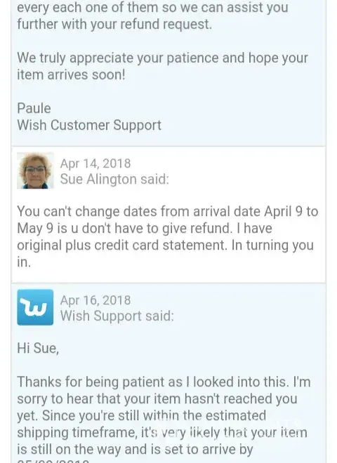 I put a 7 item order in April 3, 2018 to Wish.com. I saw on line in order to use a promocode you had to download mobile app so I did on my phone on purpose to use promo code. there was NO place on app to put code so it didn't get added and they made excuse when I contacted them more than once.I tried to track item on site and last tracking was still in China April 7th and their Arrival date was in writing Arrive April 8th . I have requested a refund at least 3 times on the site in writing and this last time they have changed the date from April 22nd to may 9th on purpose for new arrival date and refuse to give refund stating the order is still with in the dates so they cant. Now the are ignoring my last request as I old them I was turning them in. I still wanted items but with a refund as they should accomodate for the promocode they wouldn't add and the late shipping according to first dates April 9th arriving. As of right now I still have no order or refund back on my credit card. I will NOT order from them again ! To change the arrival dates on purpose is wrong so they don't have to refund. They do have to refund. Not my problem they gave date in writing then changed it. I tried more than once to get them to add promocode they just kept telling me where to put it in cart. There was NO place in order to put code on mobile app. I want refund! I have had no response to my last demand for refund or where order is. Last I track still in China! PS remember I said they changed the dates of arrival from April 8th to May 8th after I threatened to turn them in. So May 8th is not original date. I put in order April 3rd 2013. they are fraud and should be shut down. I have rest of inquries on my phone. Hope something is done.