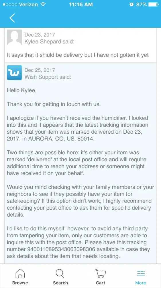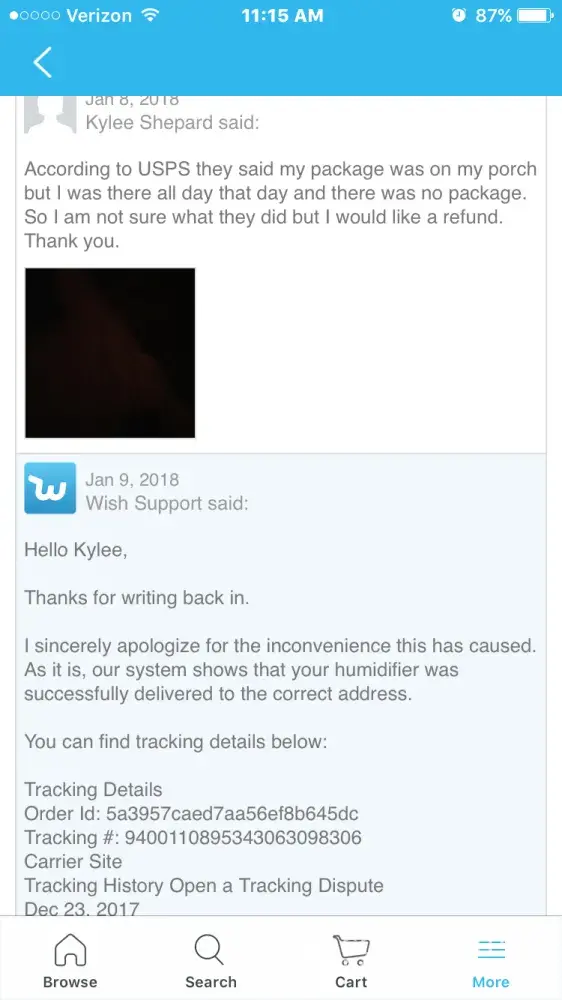 I ordered the item above on December 19th, 2017 and I was told it would not be here until mid January. Supposably it was delievered on December 23rd, 2017 around 1pm. I was here all day, at the address provided, and that package never came. Nor the next day. So I contacted wish support, they told me to use the tracking number for the item, go to my local USPS store, I did that, USPS said they had nothing under that tracking number what so ever, so then wish told me to ask my family members, did that, we searched the whole house top to bottom, and we did not find anything. I told wish support that I did all of that and the package was never found so I want a refund. All they said was were sorry this happened and we will talk with our company about this issue. Okay great. But where is my refund? That was a 30 dollar product. I want my money back.