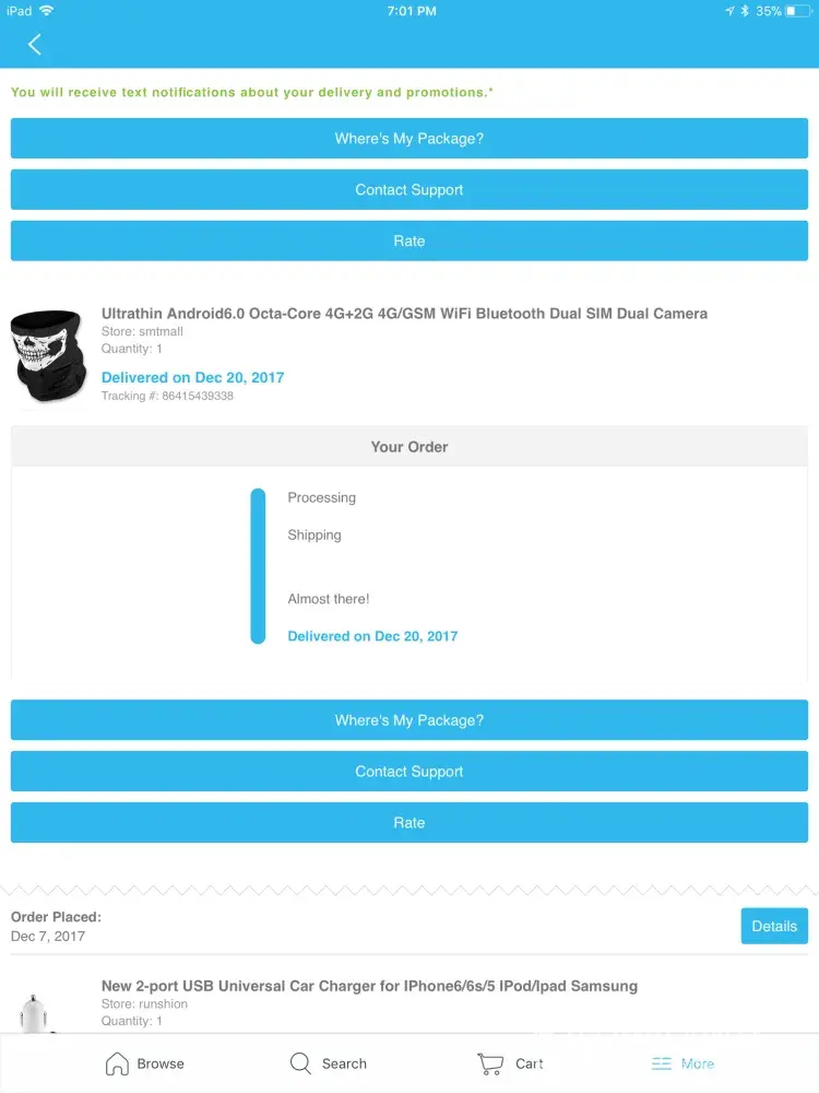 The Wish app is the worst app I have ever ordered anything from and will never be ordering from ever again. I have ordered two things from Wish and have not gotten them since November 27, 2017 when they were supposedly delivered to my apartment and I have tried everything to get a hold of my packages. I have called US PS I have called Wish I have emailed wish back-and-forth for a month now and nothing. I asked for a refund and I still got the same response over and over again that I need to call USPS and have not gotten a refund not have I gotten my items. The absolute worst at that I have ever ordered through and I will never be ordering to them ever again and I will tell everyone how my experience was because I would never want this to happen to someone else. Is pretty much a scam because now I'm down at least $30 and have not gotten my orders nor have I gotten a refund.