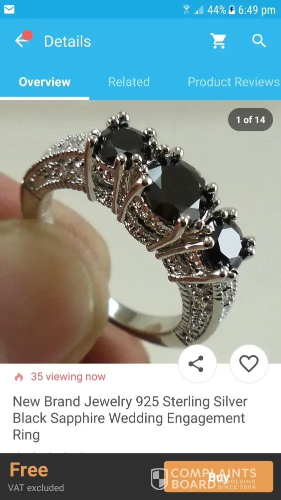 hi i am a regular buyer from wish and bought many items from the app .now i gt a black 3 stone ladies ring for 2 pple and its says 925 sterling silver one lady had hers 2 days and its turned brown after wearing it.im very dissapointed as i have spent a lot of money on there site buying items.this needs sorting as thy are selling fake silver jewelry thank you .sally atkinson you can contact me on [protected] or email s