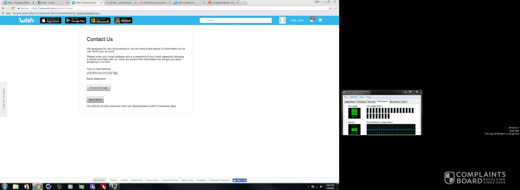 On the 26th of June, I placed an order on Wish, logging in on facebook. The order was placed, and payed for. If you look at my account summary you can see it was charged 2 times, the corrected. Since I have never recieved any emails about the order being placed, I went on the site to check my order histroy. No orders have been placed. I do have 2 different emails, so I tried logging in with the other, still the same thing. If no order was placed, why was 211, 75 euros charged to my account. Email [protected]@aliceposta.it
