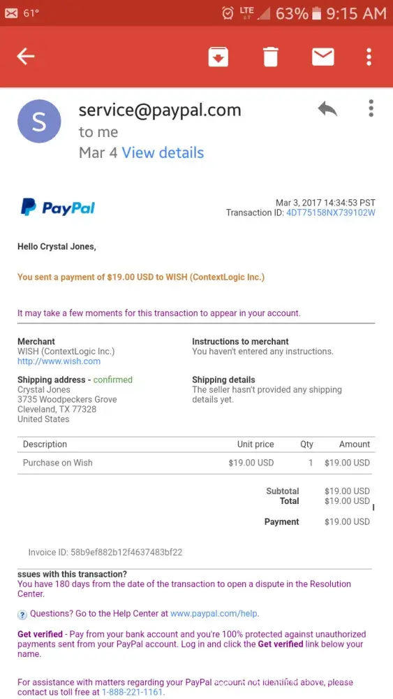 Transaction id# m3gjhqbhl1 march 3rd 2017 $1.00 2nd march 7th transaction id # b9dxes7fff $1.57 3rd transaction id #bkdm70cdoe $4.90 please here is all the info you should be able to track this down and send me my products @ 8536 esquire trail bld 2 apt 2306 fort worth tx 76244 please feel free to call me [protected] or email me @ [protected]@gmail. com