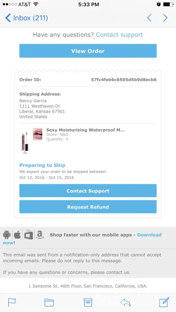 This is crazy. I'm so sick of scams and ordering off the internet, bc of places like this. If someone orders and pays for their items - how hard is it to ship them!? And no responses make it worse. The world doesn't even have the decency to make money legally anymore or give someone a heads up on paying for nothing! During christmas too. Smh. When ppl are their brokest. Thanks wish.com. U lost what could've been, a good customer.