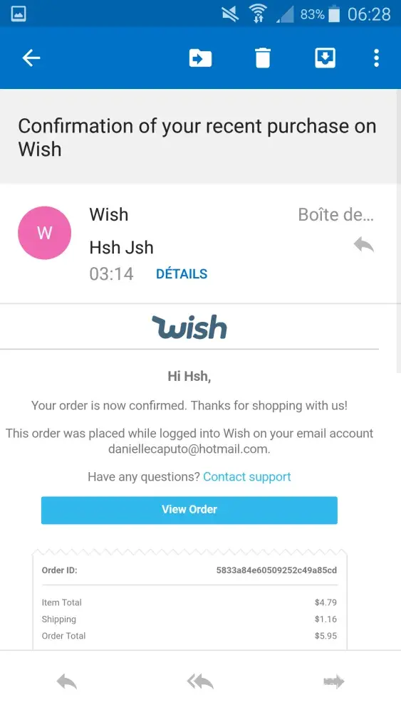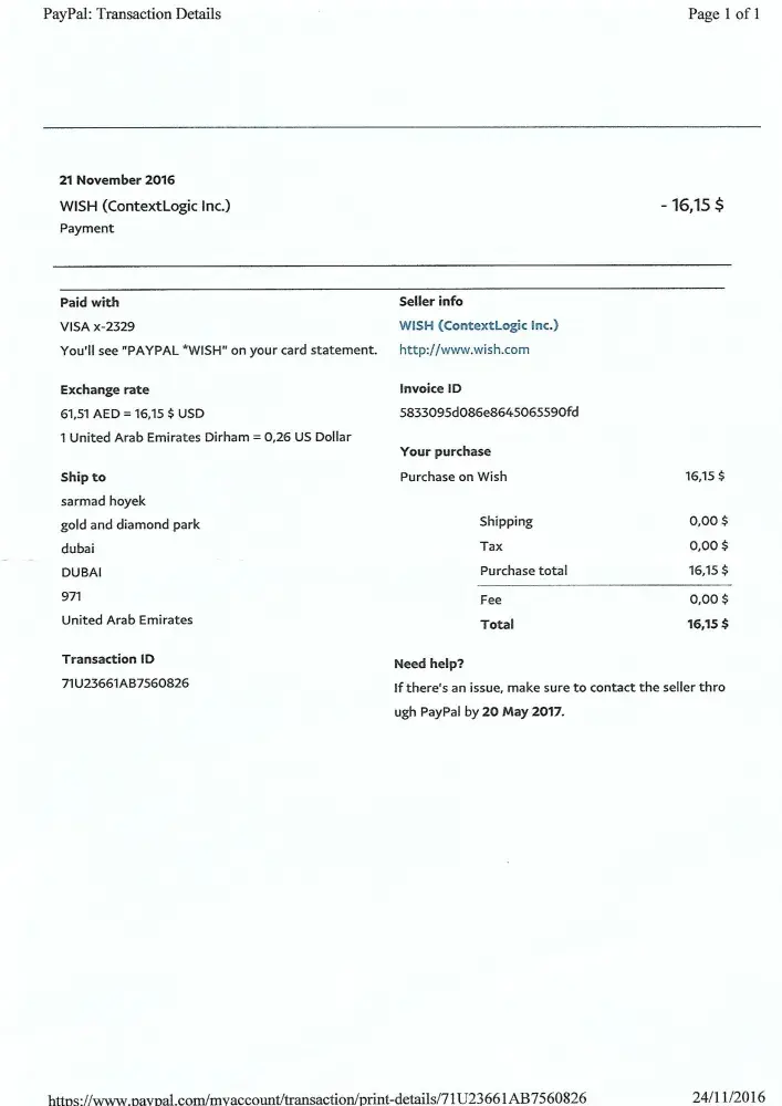 hi good day! I purchased on your online shop www.wish.com, . after checkout my order im expecting to recieved a trucking number or any transaction deatails regarding for what i purchased.., But they already deduct the money on my paypal account, . No order history on my wish account, no update regarding on my order. And im trying to communicate but i didnt recieved any reply. I hope this issue will solve as soon as posible. this is the invoice id 5833095d086e8645065590fd and the transaction id 71U23661AB7560826 from my paypal account. and if this transaction is not successful i want to cancel it and refund the money which they deduct to my paypal account.