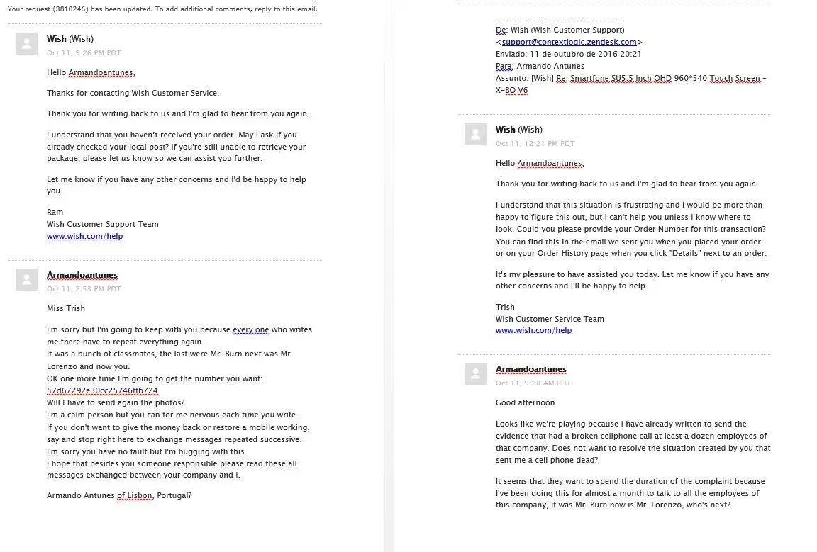 I inform you that I contacted the Portugal Chamber of Commerce and the Commercial Attaché of the Embassy of the United States in Portugal to give them knowledge of the company's online business procedures Wish.com and his bad Customer Support Service.