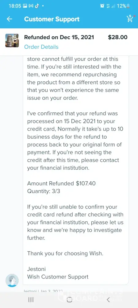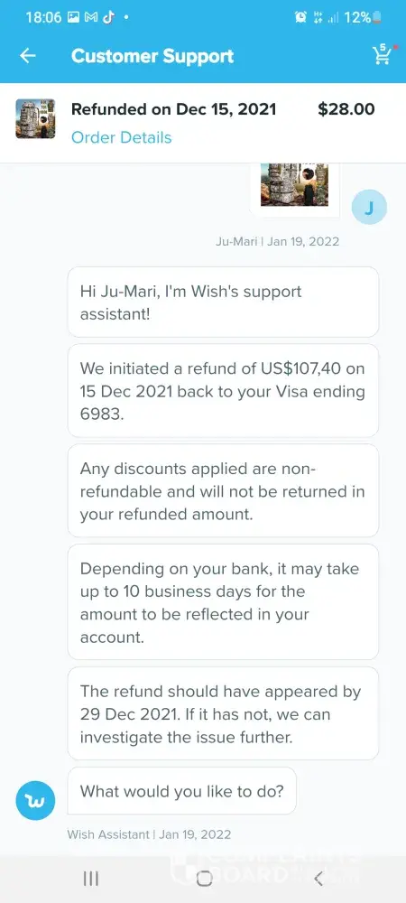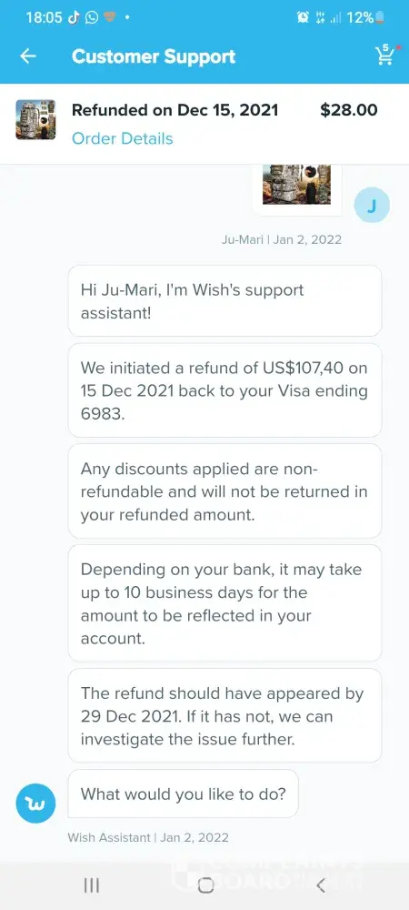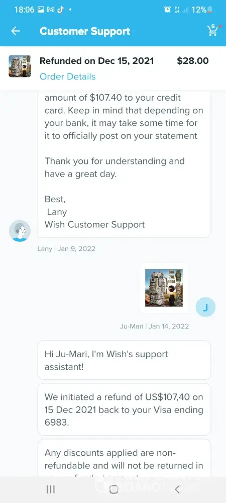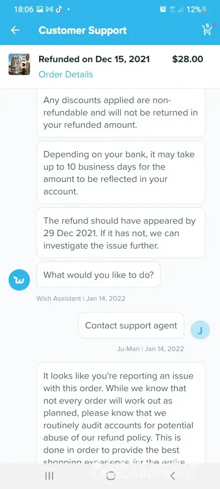 Im trying to get a refund off wish but im going round in circles these are the emails which we have sent so far hi germaine im wish support assistant we are sorry you arent satisfied with your item what went wrong. Item delivered did not meet expectations. Thanks for letting us know. Can you tell me what is incorrect about your order. Item arrived damaged. I can redirect you to a wish support aggent to better assist you. What would you like to do.Contact support agent please upload one or more photos of the item and describe the issue in datail. 6 of the boxes were split so I couldnt fit them together the front of the box wouldnt stay on so when you putvthem on top of each other the front falls off they are too flimsy to stack on top of each other. Dear customer sorry for the inconvenience caused to you may I ask if this you recieved still can be used if yes could you please keep that. No it cant be used non of it can be used the front of the box keeps falling off when you put them on top of each other I need a refund. Dear customer could you install it per manual. The boxes are so flimsy when you stack them on top of each other the front falls off the fronts dont stay on I need a refund they are of poor quality I need a refund. Dear customer in order to make up your benefit wecwould like to refund you 5%of the order amount and you dont need to return this item to us. I need a refund the boxes are too flimsy to stack on top of each other the front falls off when you put them on top of each other I dont want to keep them they are too flimsy I need a refund please listen to me when I say I need a refund im a good customer of yours and I spend a lot of money on wish please dont make it any more difficult for me I want a refund the boxes are too flimsy to stack on top of each other they are not fit for purpose again can I have a refund also six of the boxes are split. Dear customer we would like to offer you 5%of your order amount item price plus shipping. I need a full refund of £70 pound which is what I payed I have been in touch with tge citizens advice bureau and im perfectly within my rights to get a full refund. I need a full refind. I am going to write a complaint letter if this doesnt get sorted quicker. I shouldnt have to ask fir a refund this many times. Sorryto hear the item which could not work normally (doesnt even make sense) we would like to offer you 5% of order amount which is item amount plus shipping fee. Each item would have been quality checked when its out of the warehouse. Suppose its not big issue (dont know what they mean by that) could you let reoair man fix locally. Ifvit could be fixed would you like to keep this item. For the 6th time the boxes are too flimsy to stack on top of each other when you put them on top of each other the front falls off. I dont want to keep them they are not fit for purpose. Ivwant a full refund of £70pound I couldnt be more clearer I need a full refund I dont want to keep them. If I dont get a full refund when you txt me back im going to write a letter of complaint. Please hurry with your reply im pulling my hair out at this very slow process