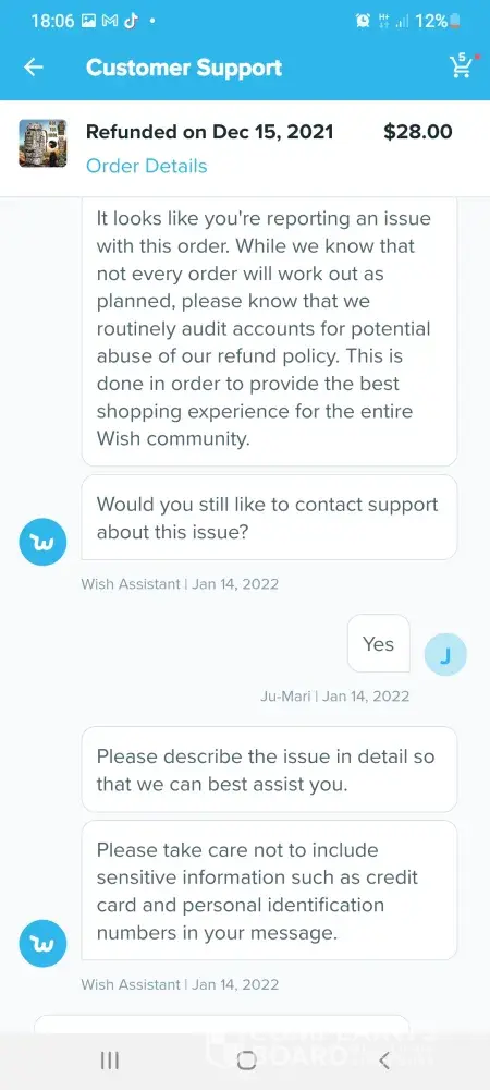 Wish they ask me to send 2 pieces of information from me to go ahead and make the changes to let me buy an item transmitter and receiver to my audio video AV they need ID and then they blocked the account when the time i want to process to purchase and pay from my paypal ..I believe that website and app is scam. I still have money in my wish account I can't use it . customer service they didn't respond, I've been 2 week with sent too many complaint but no one responded. Always they told me by email they receive it and the customer service agent will be responded to three business day but that is fake not real and unhappened
