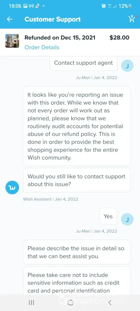 First everything was going ok, then my order shows up and there is nothing in the order that's right. I ordered a titanium skull bracelet, a 316 l stainless steel st. Loraine's cross ring, a swiss army watch and a multi colored watch. When I opened the order, I got in touch with wish customer support right away. I hadn't even finished going through the package when I logged in to support. I took pictures of the package, the label and all the bags inside and their labels. Then I took pictures of the merchandise inside, in the bag marked titanium skull bracelet was a small pack of kids stickers. In the bag marked 316 l stainless st. Loraines cross ring was a chrome plated pot metal cross ring for kids. (it said boy's on the label) the swiss army watch was broken. (a crack in the case that ran through the crystal) and the multi colored face watch was junk. (the battery leaked and corroded the movement) I took pictures of all of this and sent them to the wish agent. They sent back a message that someone would get back to me in 2-3 days. 2 days later, I get a message from another agent saying that she's sorry I had a problem with the swiss army watch and could I send pictures of the item and give a detailed description of the problem. This went on through 10 more agents until I lost my cool and sent an email in caps telling them that in was the whole order, not just one piece of the order and how I was sick and tired of the run-a-round and having to give all this information to every person that works there just to get the merchandise I paid for shipped to me. Now I can't log in to my account and they keep sending emails asking why I don't respond to their agents.