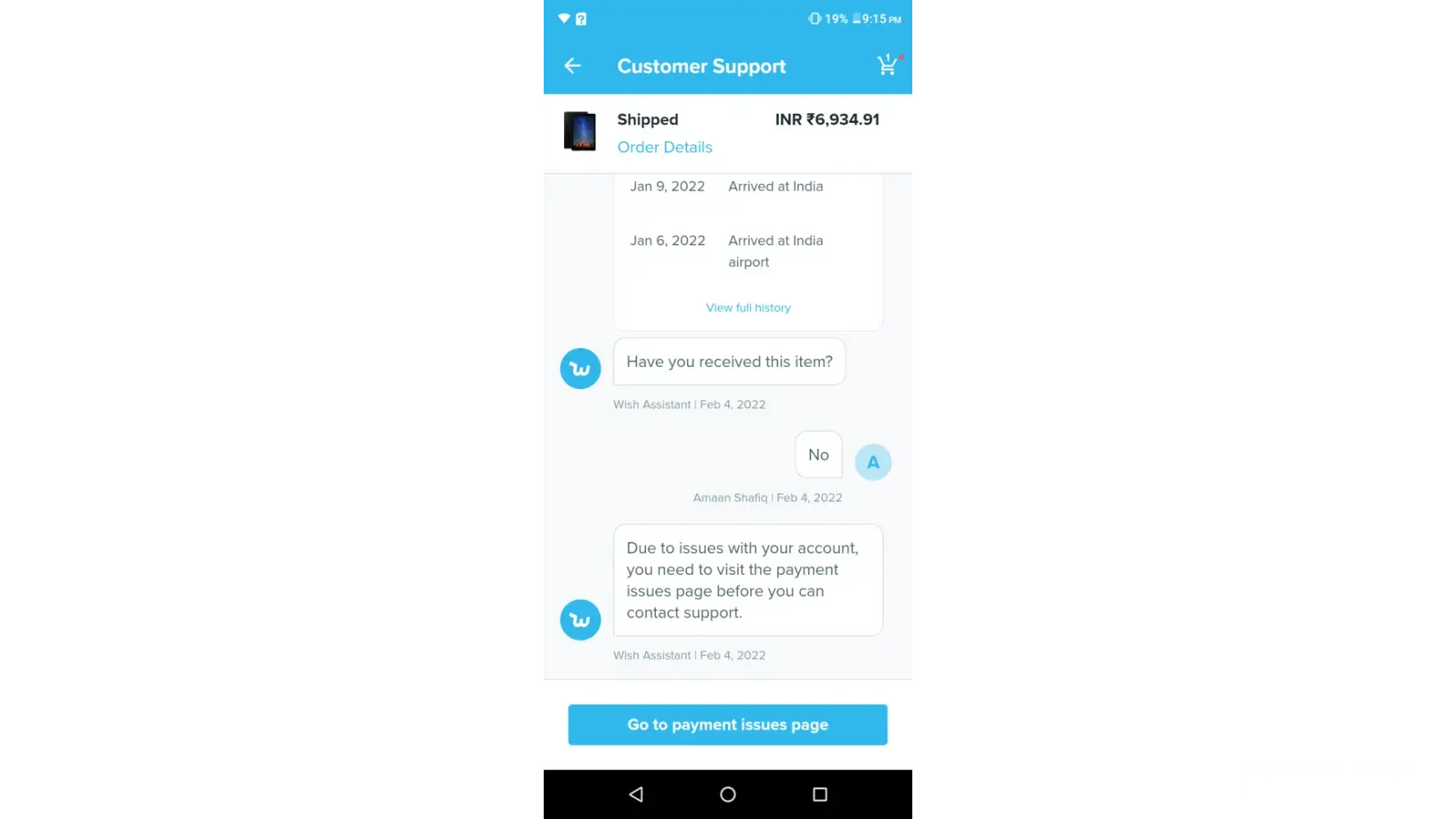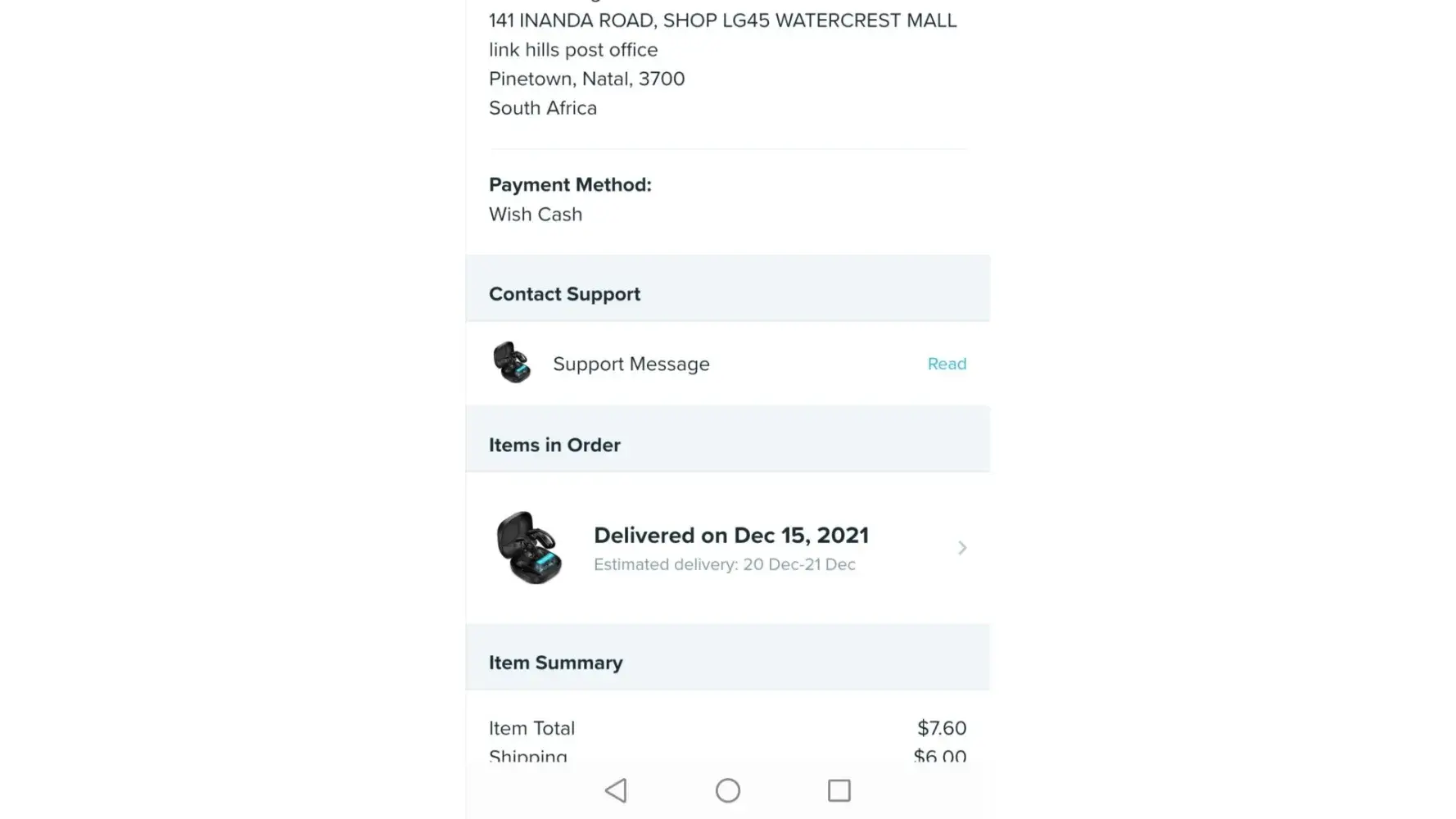 Wish delivered my order to the incorrect country and is refusing to refund or replace my item. They said my order has been delivered which is true but someone is enjoying my item. Whenever I email they don't reply and when I try to contact them on the app I am flagged with an error of payment issues, when I try to upload my ID then there's another error. This incident occurred in December, I have not received any response from wish. I reside in RSA but my order was delivered to USA