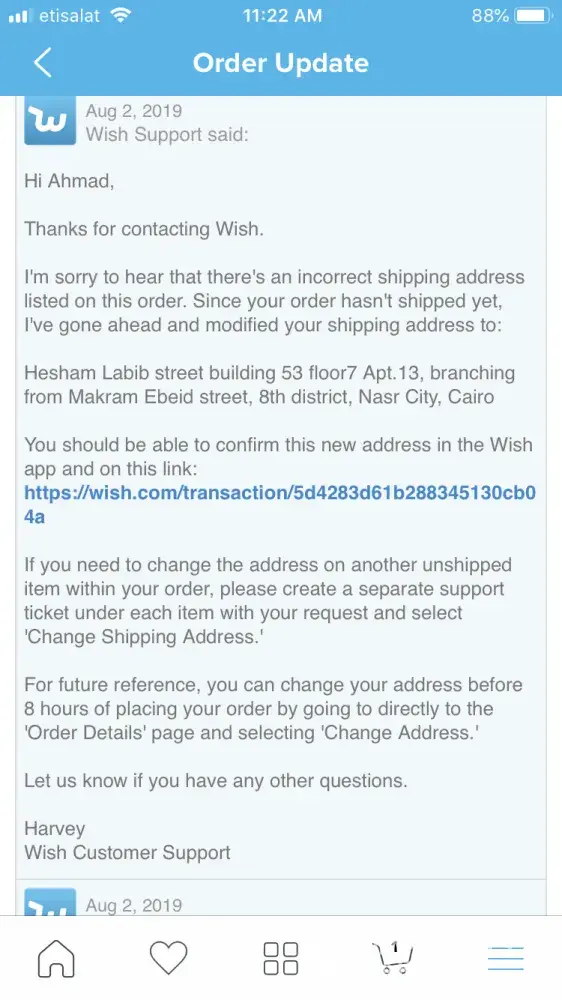 One of your employees called Harvey replied that he changed my shipping address of one of my items as requested, however after rechecking my address is still the same on this order! So I replied please confirm that you changed the shipping address because it shows faulty address in order details, I even attached a photo showing a screenshot with that, carelessly he just copy pasted his reply as if am speaking to a robot! Which I wouldn't mind if my problem got solved. However after double checking faulty shipping address is still present 👎🏻