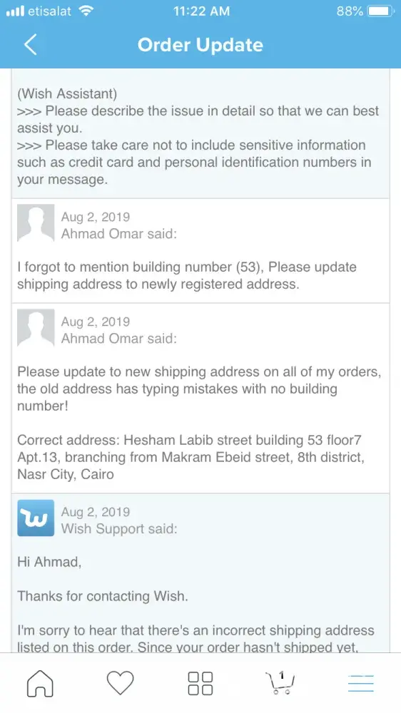 ordered several items from wish however, when checking out My shipping address included typing mistakes and I forgot to mention building number! So I contacted customer support for help regarding some of the items and regarding the rest I couldn't even go through to reach your customer support employees due to stupid autonomous menu !