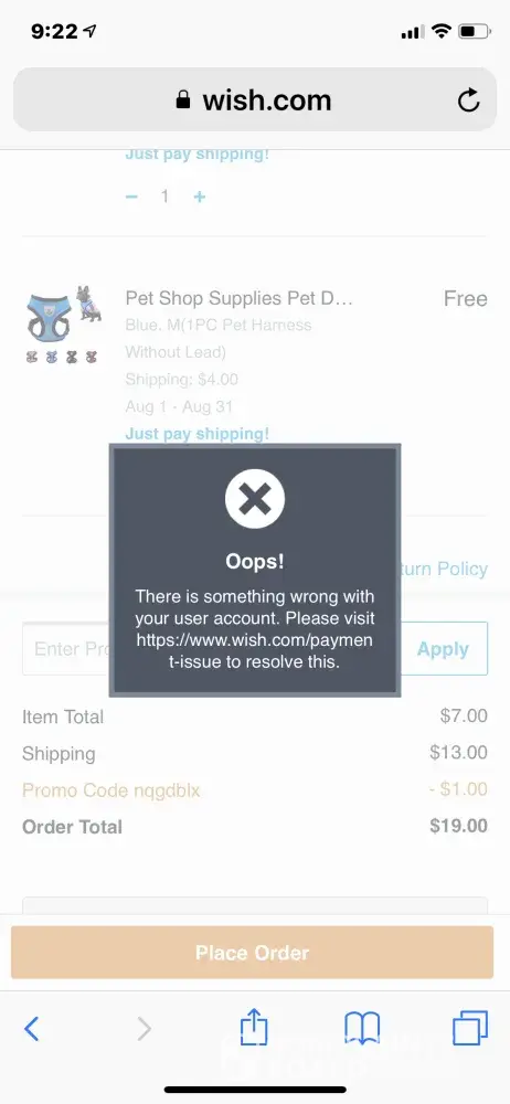 Ayuda Wish.com / hay algo mal con su cuenta de usuario. por favor visite https://www.wish.com/payment-issue para resolver esto. No se que hacer
