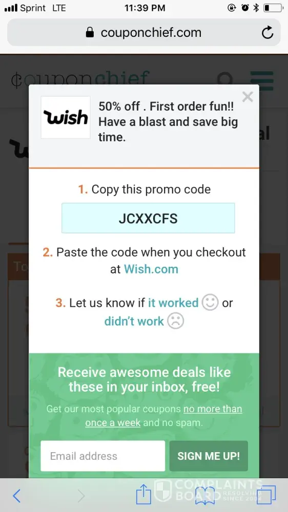Wish company had an promotion on it's application, that I downloaded to my phone, for personal shopping. This contest encouraged you too log on too your account everyday and on the 7th fay you would receive a stamp for 50% off your next purchase. I did this and received my 50% off stamp. However I went online and purchased a marlyin monroe tapestry, and a marlyin monroe headphones set. My card was charged full price. I went back into my application and checked my promotions, and the stamp read 50%Off my next purchase AFTER! I get a friend too join and theu buy something, THEN, my next purchase is 50%off. B.S. I called my credit card and put in a dispute which could take 90 days to resolve. I tried too cancel my order on the website, however it says someone will respond in 72 hours. We know thats just enough time for the card to approve the purchase so they can call and laugh. The contest was a set up too have people make activity on their website too mislead investors.