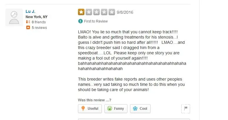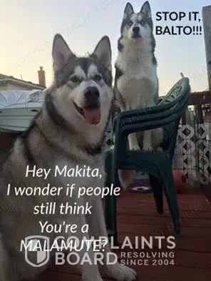 I am involved in a law suit against this woman because of slander, defamation, using my name which makes it a civil suit now and also I can sue because she is not honest about her dogs. Balto also has behavior issues because he has been in pain. Ir cost thousands of dollars for medical bills...