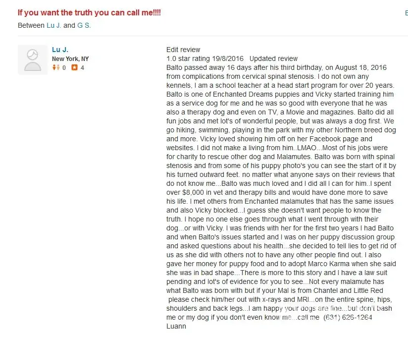 Now Balto just turned 3 years old and his doctor had full x rays and MRI done and he was diagnosed with spinal stenosis and his neck was severe. So severe that he dis not qualify for surgery. He also had bad hips, front shoulders and a bad left leg. My dog was in pain and Vicky Deming had blocked me from all social media when I told her Balto was in pain and not well so potential puppy owners and owners who have her malamutes on her discussion pages will not hear about this. When I told friends to get in touch with her so she could stop breeding these dogs she posted an old post that I had sent to her when he was a baby and that he was fine as a baby so I am a lair. ( You cannot tell in most dogs that have this disease until they are usually much older) She knows this. Anyway she got crazy and was telling her Facebook people that I am a pedofile and posted on Balto's therapy dog page were he was with a young boy in a wheelchair. I am a special needs teacher at a Head Start program for many years. She also took my emails and changed them? She now is posting that I abuse dogs and even has a photo of a pit bull with marks on him from a fight and says I did that to this dog?The woman holding this pitbull has a wedding band on and dark crly hair...I have long blonde straight hair and not married and have a Husky, malamute, Chihuahua and another small mix pekengese that I resued. Other Enchanted Dreams Malamute owners got in touch with me to say she did the same to them when their dog was found to have the same problems.