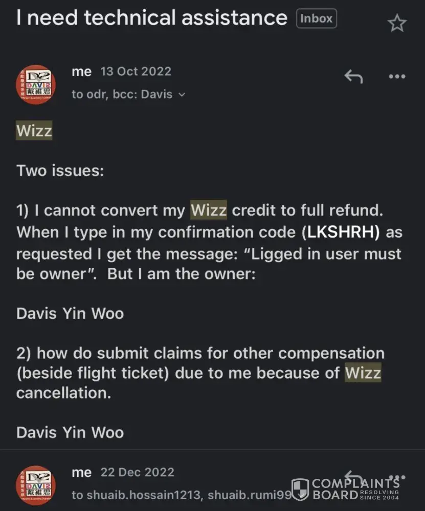 As a result, when I arrived at Bucharest Airport in Romania to check in for my flight to Dubai, I was informed that I had to pay a check-in fee due to this issue. I was advised to request a reimbursement from Wizz Air, as this error was not caused by me.