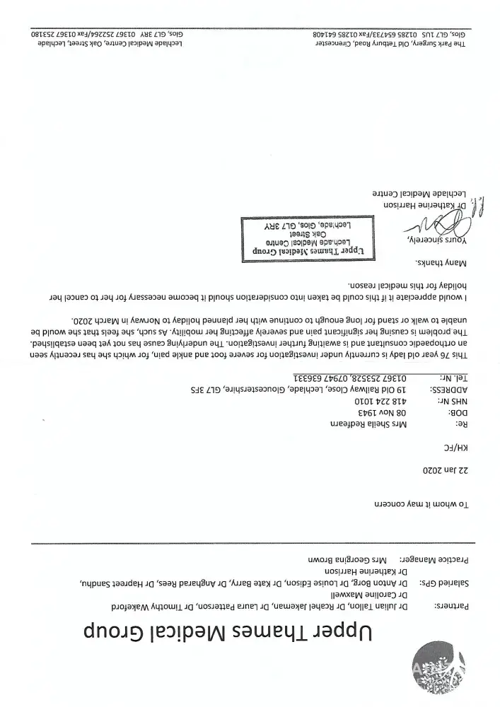 The circumstances behind this cancellation are medical. My wife Sheila Redfearn who is 76 has developed a serious foot problem as verified by the attached Doctor's letter.