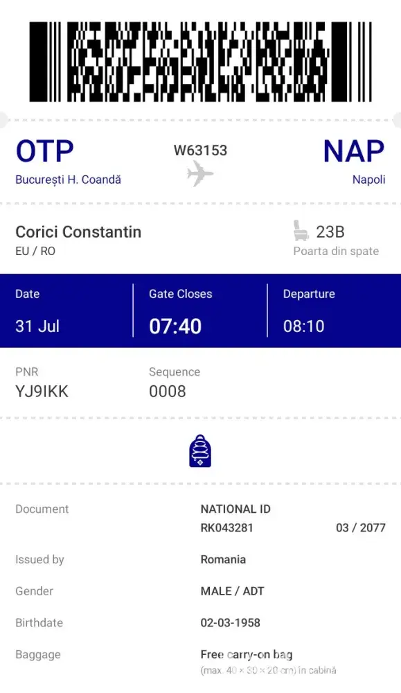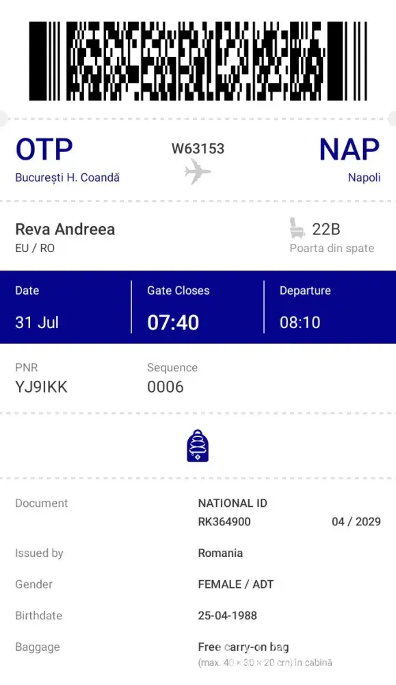Ne au ținut la predarea bagajelor 4h și jumătate, noi am fost cu 4 h jumătate inainte de zbor in aeroport, am mers la ea I am explicat ca pierdem zborul și ne a asigurat ca nu vom pierde pana nu sunt toți pasagerii în avion, surpriza avionul plecase.mentionez ca au bagat alți pasageri înaintea noastră de la alt zbor.