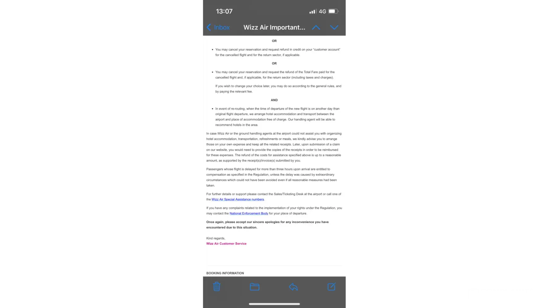 Called wizzair customer service to find out to my surprise that all flights had been cancelled with the next available flight for the 07.06.22, having no other option booked that flight, please note that the proposed flights was 1 week over the original booked one.