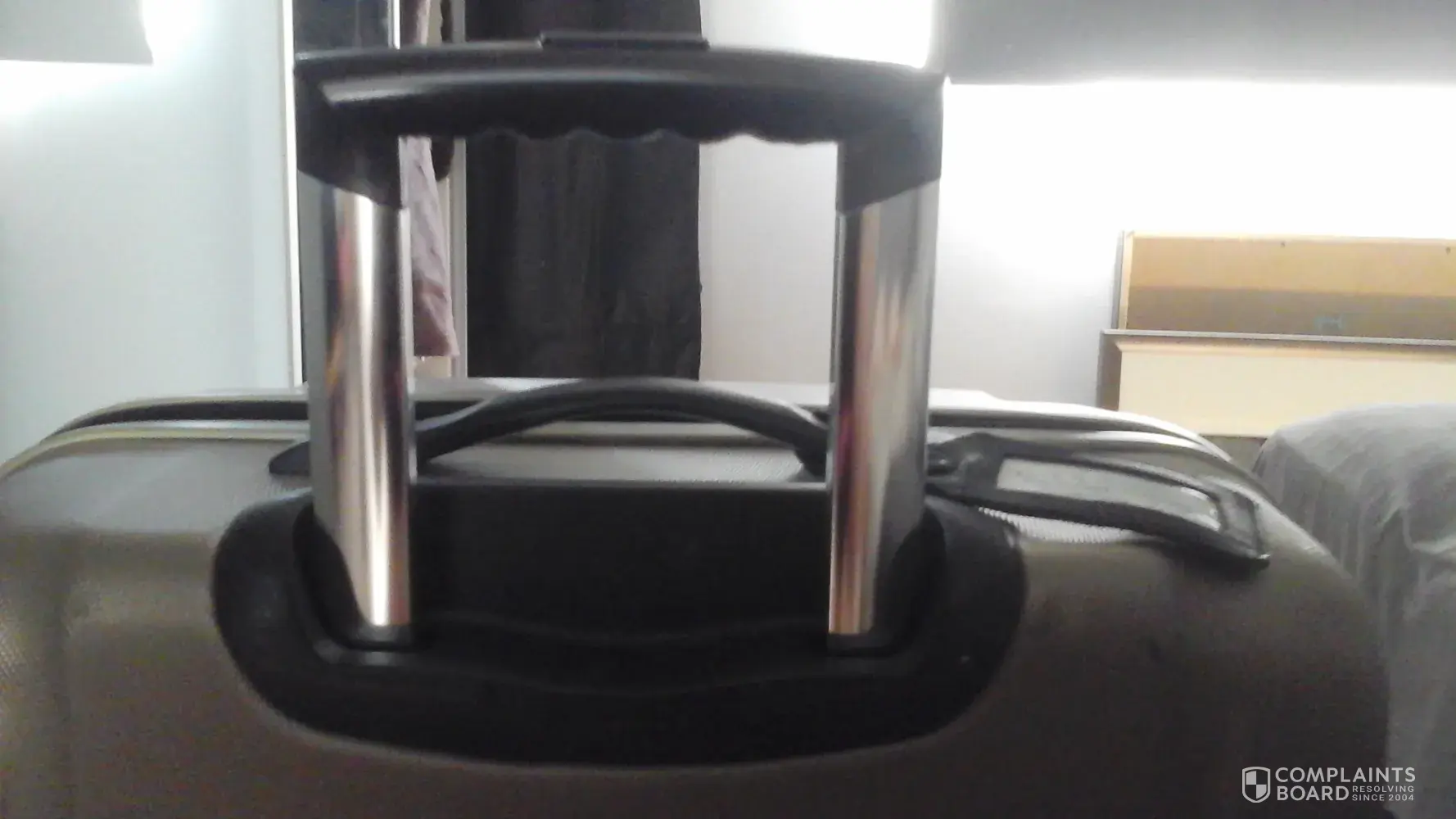 Ved ankomst til Bergen, I dag 25.7. 2018, var Håndtaket på kofferten ødelagt. Det er det Håndtaket som kan dras opp og ned. Nå kunne det med anstrengelse dras opp ca 10 cm, men skal kunne dras opp ca 25 cm.