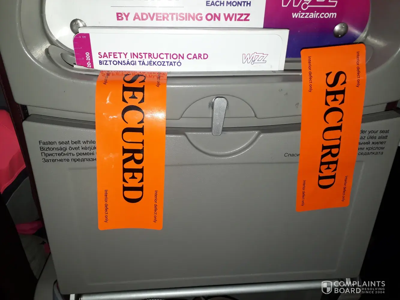 We again check in our luggage, not as smoothly run as in England, explaining that yes will need help getting on the plane but not requiring aide to get through to departures. The check in staff member then queried how many bags we checked in, and despite again being well under the 60kg, excluding the 40kg combined hand luggage we were permitted and also elected to have one of the hand luggage to go in the hold, we were informed that we would have to pay 65 Euro's for the fourth bag, as the weight is irrelevant and we had only paid for three bags. To say we were disgusted is an understatement. Please explain how in England common sense ruled and there was no issue but we were held to ransom in Bulgaria? Fuel is measured on weight not how many bags, an absolute slur to the end of our holiday. Hence we require a full refund. To add insult to injury, once we were seated (and this time we were all permitted to go on together and was first on the plane, row 29a to c), we were informed that Wizzair policy is that the disabled person has to sit next to the window (wasn't explained on trip out), not that it mattered as my Dad more than happy to sit by the window, however a strange policy all the same. Then as you will see photo evidence, my fold down table was broken, it had two orange stickers trying to hold it up - which was useless and not fit for purpose (the hostess said that should it keep falling down to let her know, I replied it keeps doing it and that was while we were still on the ground) - What a major safety failure- compare this to the trip out where we had continual turbulence so couldn't have table down/drinks stopped/unable to go to the toilet. But it is ok for useless stickers pretend to keep a table up, why should I have to keep holding it for three hours odd? should we of experienced the same severe turbulence, whom would be failing in safety of their passengers because their equipment is not fit for purpose. More amusing still, my Mum whom was in 29b, her table would not sit flat when pulled down, so she was unable to rest her cup of coffee on it, however not a problem to use mine as it helpfully was unable to stay up.