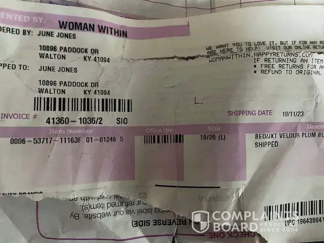 The item ordered on 10/800/2 was a velour plum bed jacket. The item that arrived on 10/21/23 was a gray and red jacket. see attached photo, We contacted customer service on 10/21/23 and was given a run around. The item was final sale with no return. I understand that, but when the item received was the wrong item a refund should be provided.