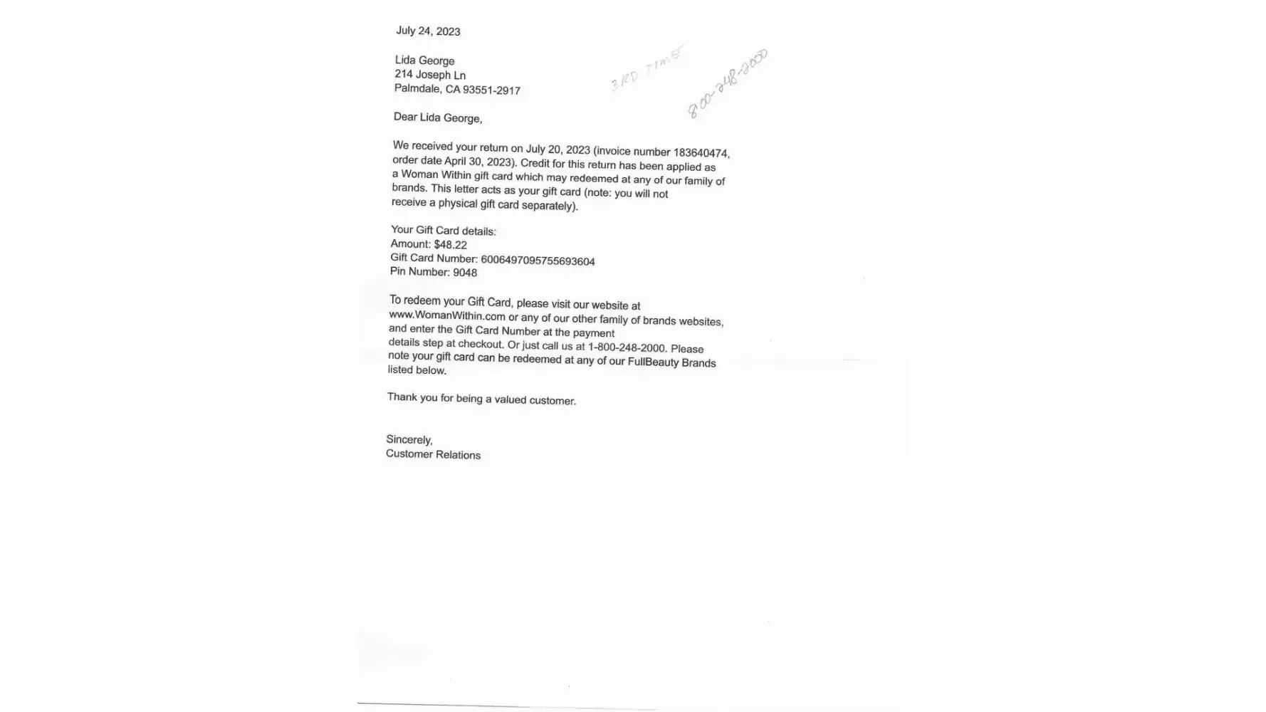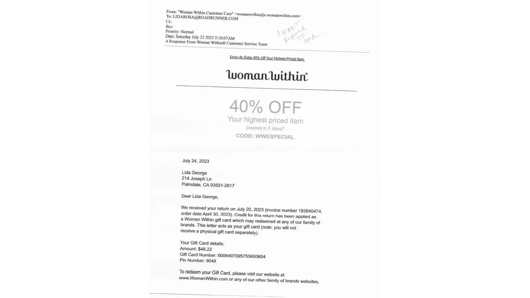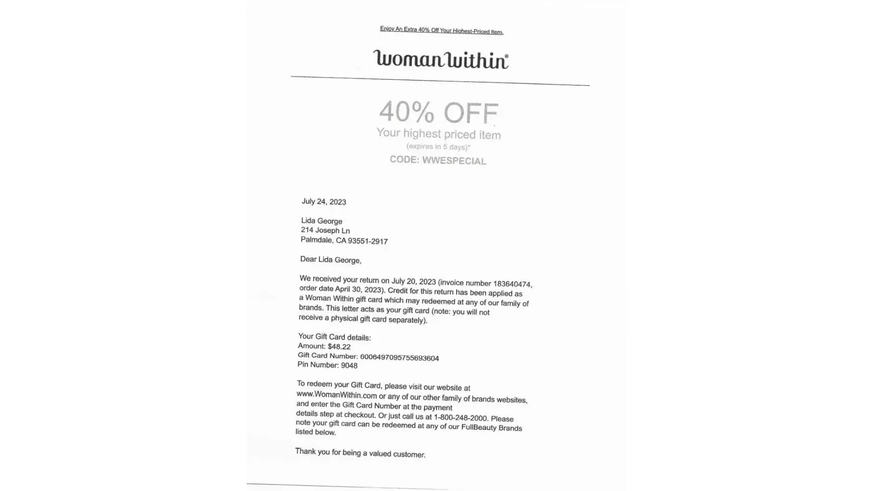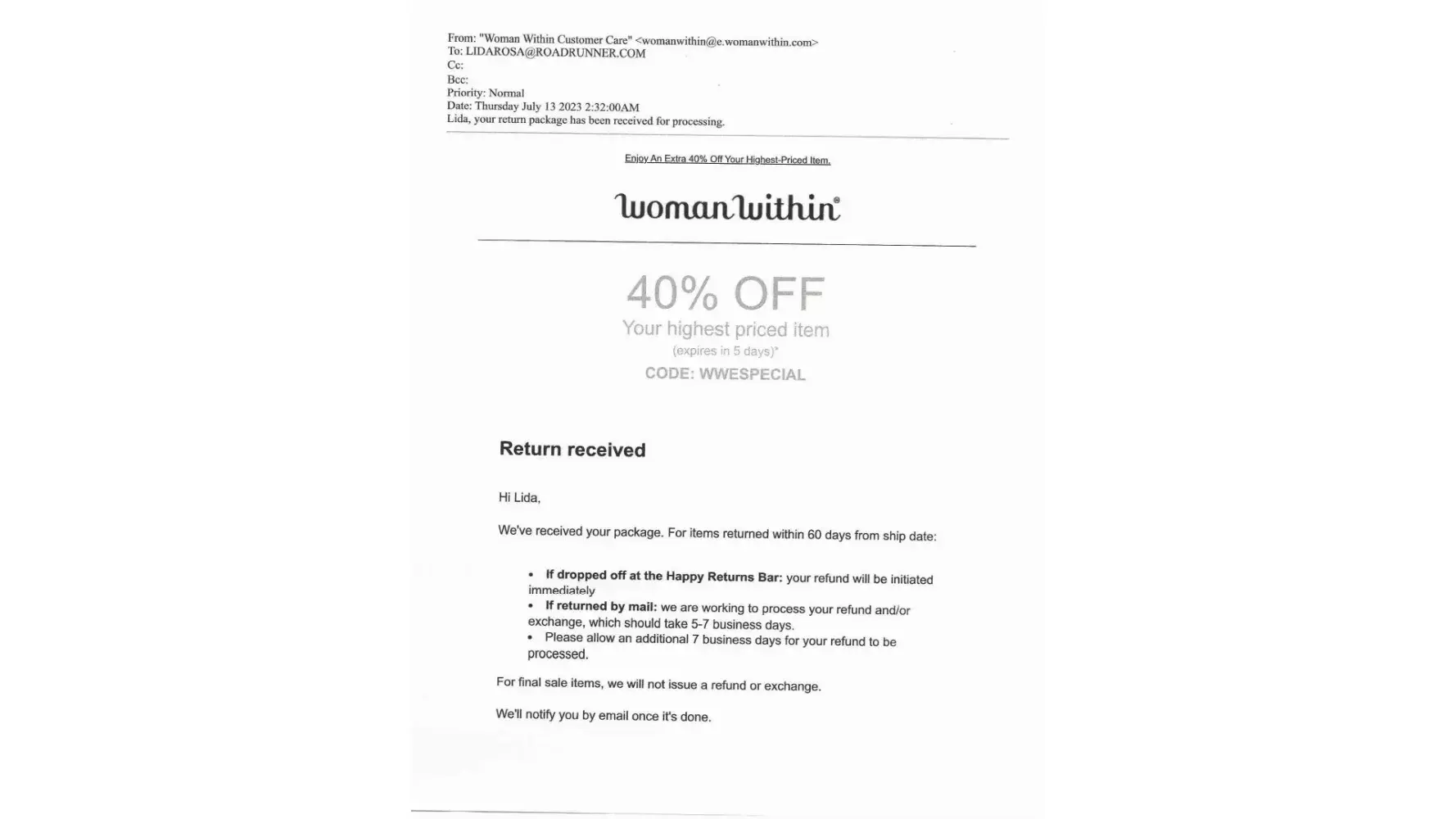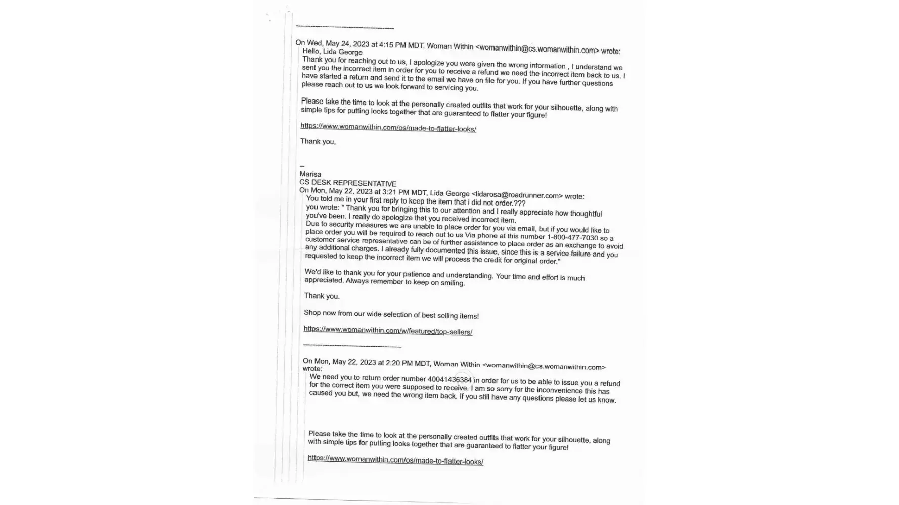 The customer service representative at Woman Within was not at all helpful today in resolving the issue. I had to ask twice to speak to a supervisor and her response was "Absolutely, but they are going to tell you the same thing." Turns out that was true. The supervisor was unwilling to try to help with the problem until 20 days after the initial shipment.