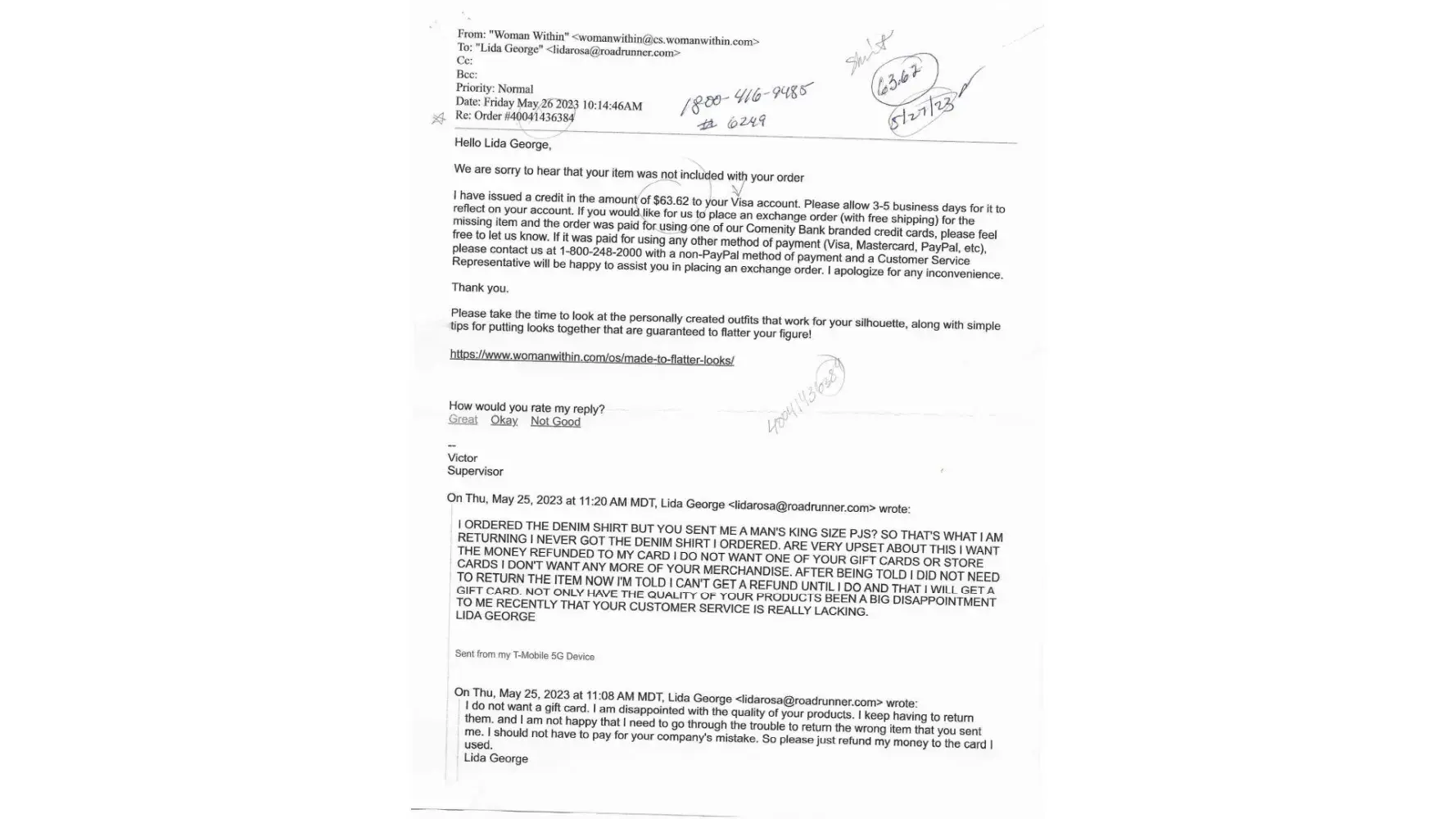on 4/30/23 I placed an online order through Woman Within for a woman's denim shirt Item #[protected] $48.22 total. I received a mans sweat pants and shirt in XXL. There are no XXL men in my home. I did not order this. But I was charged 63.62? So I initated a return and asked for the credit to be made to my original card. But they gave me a credit for their site. I replied that I am done with their company because everything I ever ordered was just not what I expected and am not interested in purchasing from them again. they replied that I was ok that they would issue a credit to my card. But they sent me another message that the credit would be a store credit. So I have been going back and forth with this since then. I initiated the return within the time they said I had in order to get a refund to my card. Still waiting. They have stopped replying to my messages to give me my money. I am so done with them. their products quality has degenerated over the years and their sizes keep changing. I am sick of this treatment. Been a customer for years.