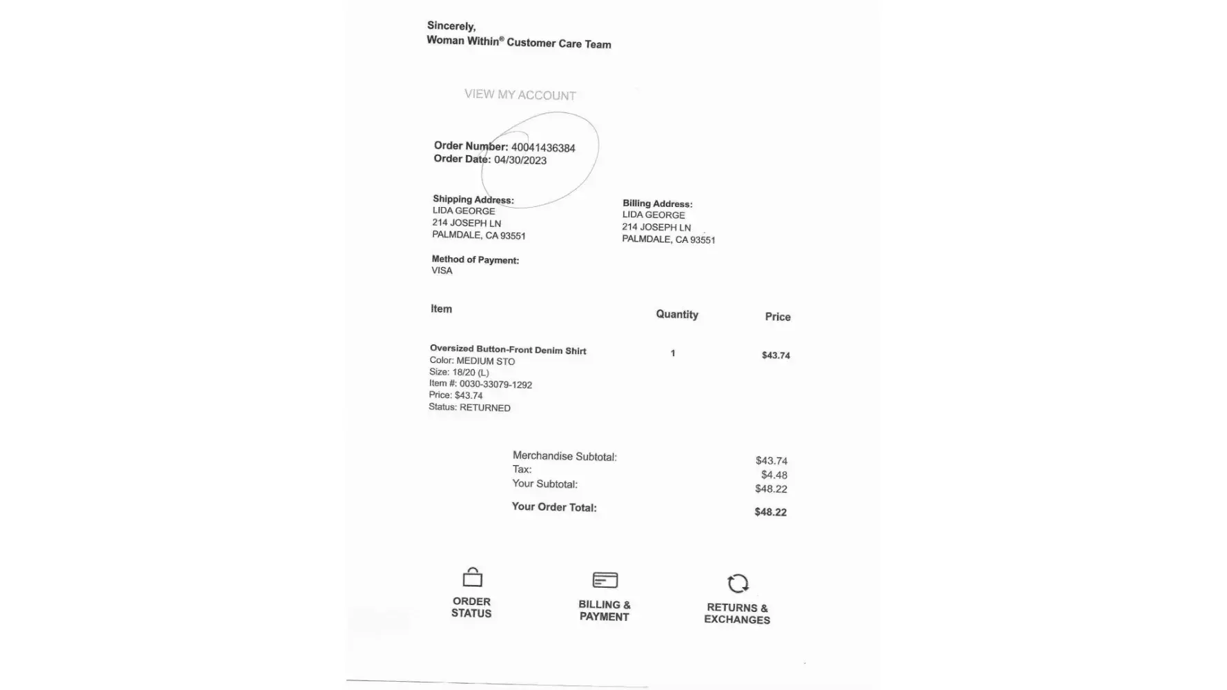 Several months back I ordered three shirts from woman within.. When the order came it contained one of the shirts I ordered, one I did not from Romans, and the third never came. I contacted Woman Within and cancelled the third shirt and arranged to return the one I never ordered, which I did.